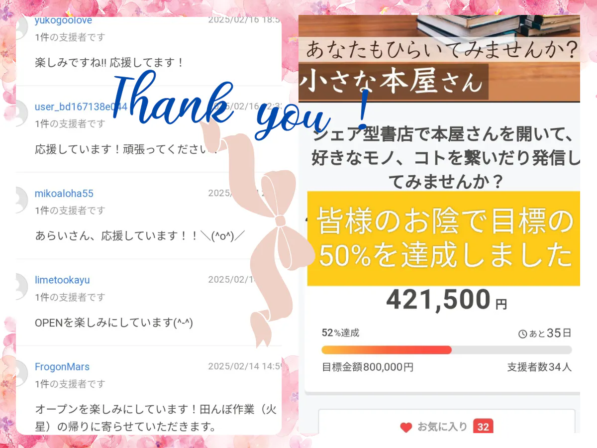 個人ブログのInstagramで繋がっている、ワンコママさんさんからのお気に入り登録やご支援、本屋準備中繋がりでSNSでお友達になった方や創業スクールの同期や先生からも(勿論、親戚、友人知人の皆さんも)ご支援いただきました。