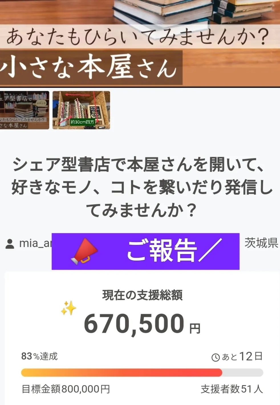ですが私の力不足で、まだ目標額までもう一歩というところで届いておりません