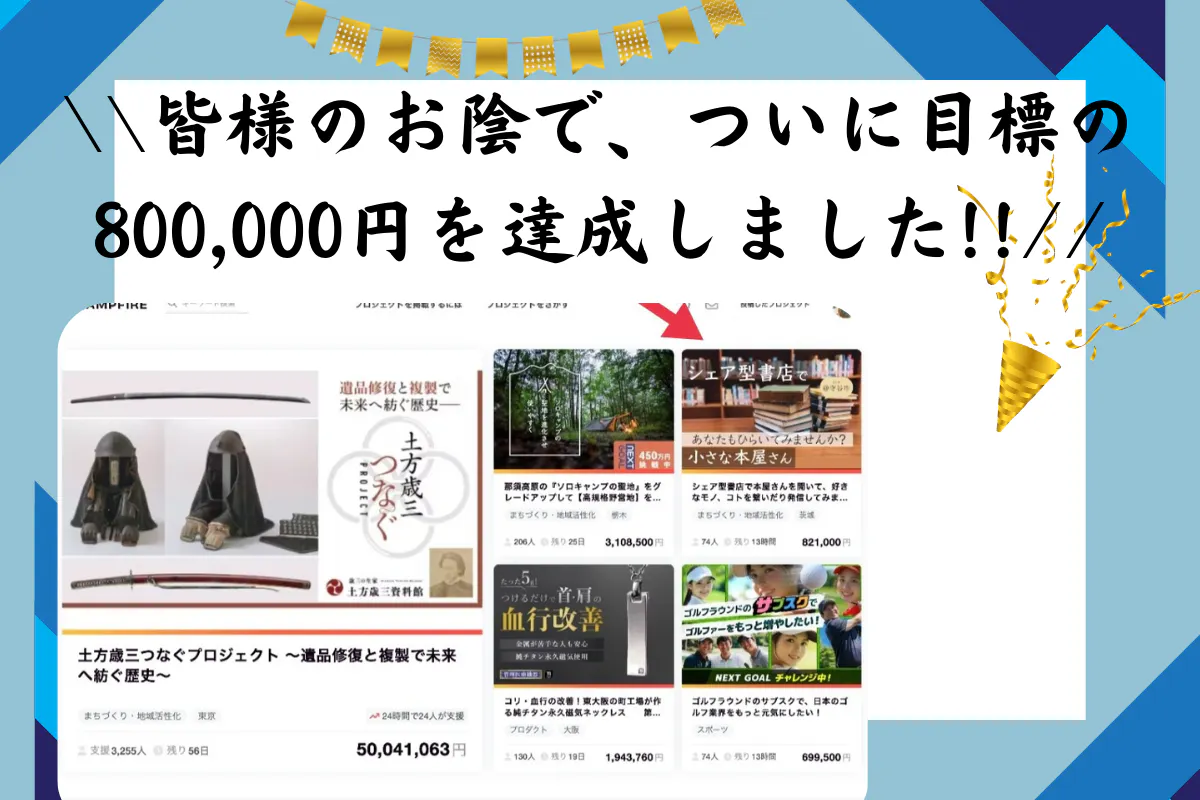 そして終了日前日の昨夜、21時48分に目標金額 800,000円を達成し無事SUCCESSすることができました!!