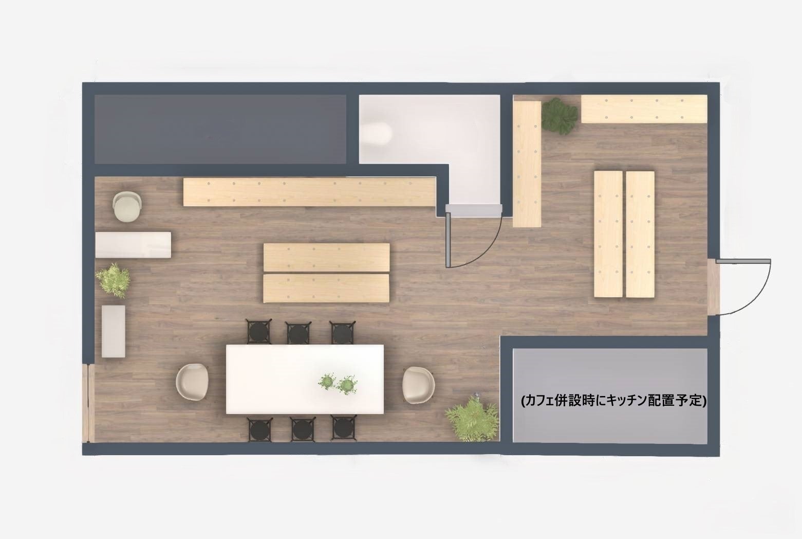 壁一面に棚を置いて、一箇所 約30cm×30cm×30cmの本棚を、棚主さんたちでシェアしていただく予定です。(配置イメージでは床の色や本棚の色は異なります。配置が変更の可能性もあるため余裕をもって本棚を少な目に配置しています)