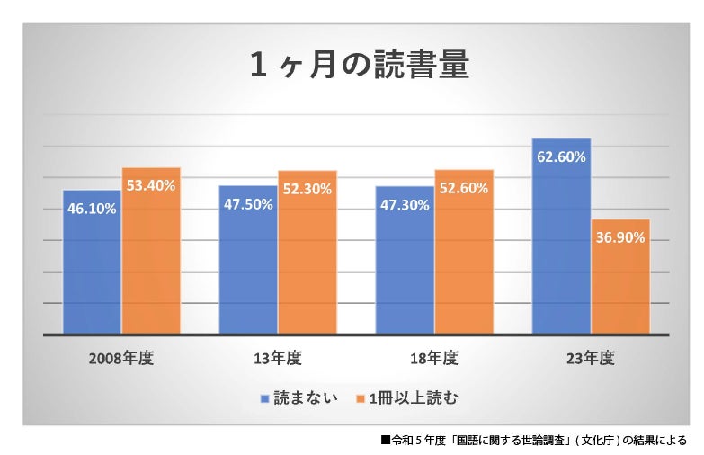 文化庁による、令和5年度「国語に関する世論調査」の結果によると、国民の1ヶ月あたりの読書量は年々減っており、「読まない」と答えた方の数は実に62.6%におよび、「1冊以上読む」と答えた方の36.9%を大きく上回っています。