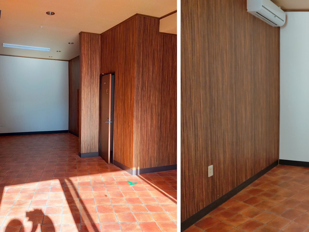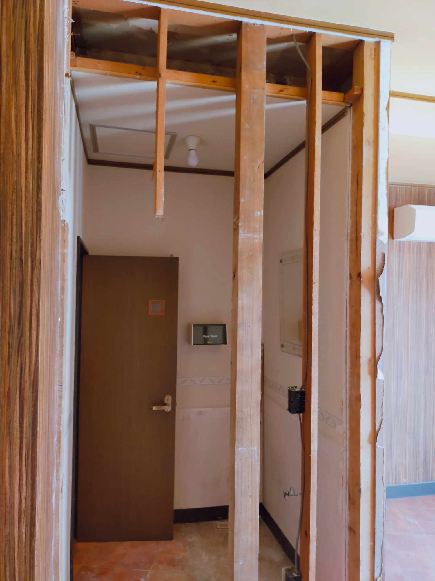 正面の白い壁部分を解体して少し広げ、左側の茶色の壁も解体できる部分は解体する予定です。