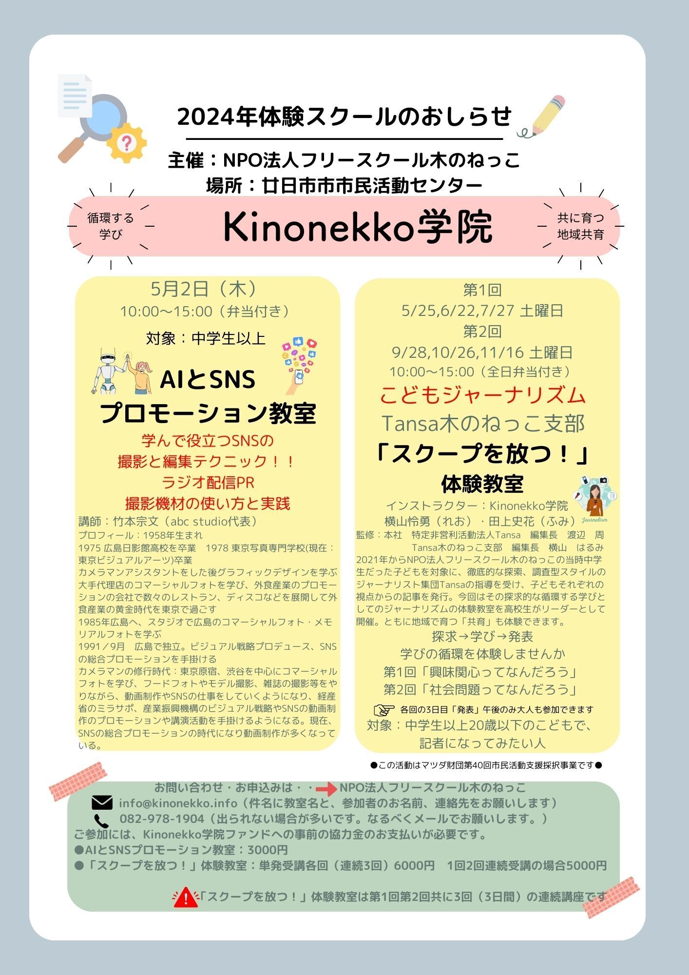 クラファン終了して半年がたとうとしています。やっと秋らしくなり、活動もしやすい季節になりました。リターンのご連絡がまだつかない方に定期的にご連絡をしています。先日もご登録メールにご連絡させていただきましたので、ぜひ折り返しご連絡をお願いします。リターンのショート動画を作らせていただけるかのかと、寄付にされるのか、また、どなたかに権利譲渡のご相談にも応じますので、お気軽にご相談ください。以上よろしくお願いします。また、ご連絡がついているご支援者の皆様にはKinonekko学院公式ラインへ入っていただいております。↓https://lin.ee/JfJlbp5もし、まだ!!とか、あ、消しちゃった!!とかって方がいましたら、再度お願いします。その際、お名前と、ご登録アドレスの@より前の部分を教えてください。それから、ご支援者じゃない方からも、最近は、ご依頼をいただくこともあります。その場合は、お名前を教えてください、内容や、料金のお問い合わせも受け付けています。こちら、撮影の様子や、成果物を投稿しています。是非ご覧ください。instagram↓https://www.instagram.com/hiroshima_v?utm_source=ig_web_button_share_sheet&igsh=ZDNlZDc0MzIxNw==では、最近の活動報告です。ぺあせろべという国際交流のお祭りに参加してきました、支援者の一般社団法人ええじゃん代表理事の栗林さんのリターン動画の撮影と編集でした。現在、広域通信制高校2年生のれお君が中国帰国者のグループの撮影をしました。ええじゃんのホームページに、近々、外国人支援や当事者グループの出店やステージの様子をおさめた「ぺあせろべ2024.10」の様子が貼り付けられると思うので、ぜひご覧ください。ちなみに「ぺあせろべ2024」1月の様子を撮影したのもKinonekko学院SNSプロモーションコース立ち上げ前の、子どもたちでした。このころは手振れもひどいですね、今見ると。また、FMはつかいちの局長 倉本さんへのリターンもスタートしまして、レギュラーパーソナリティーのみなさんお一人づつの担当コーナーの撮影に伺っています。FMはつかいちさんのSNSや、はつかいちゆめタウンのモニターなどで近々みられるかもしれません。こちらは のりぴぃさんの撮影風景です。彼女のブレないダンスとスタンス、フリーダム感、すばらしい映像が撮れました。お楽しみに!!最後に、こちらは古い付き合いになりますが、愛がいっぱいどれみちゃんの撮影に、こちらも県立高校通信教育コースに通うふみさんが行きました。例えば、1万円までのリターンは撮影が本来ありませんが、年内の作成動画の数を消費して、撮影にあてることも可能です。ぜひ、ご相談くださいね。テロップやエクストラのご注文は、ご支援者には破格でプラスさせていただいています。それにより、学院生たちのスキルもめきめきと上がっています。Kinonekko学院SNSプロモーションのインスタラクターである2人はご存じのように現役高校生であり、バイトをしたり、Kinonekko学院やフリースクールのボランティアをしたり、もちろん青春を謳歌せねばなりません。それでも、クラファンでご支援してもらった御恩と、自分たちの自由と責任と、その後に続く子どもたちのためにがんばっています。お待たせしている支援者の皆さん、来年4月までがリターン着手期限となっております。公式ライン登録しているみなさんにはまた随時ご連絡をさせていただきますが、どうぞ暖かく、厳しく、引き続きよろしくお願いたします。Kinonekko学院事務局 横山はるみ