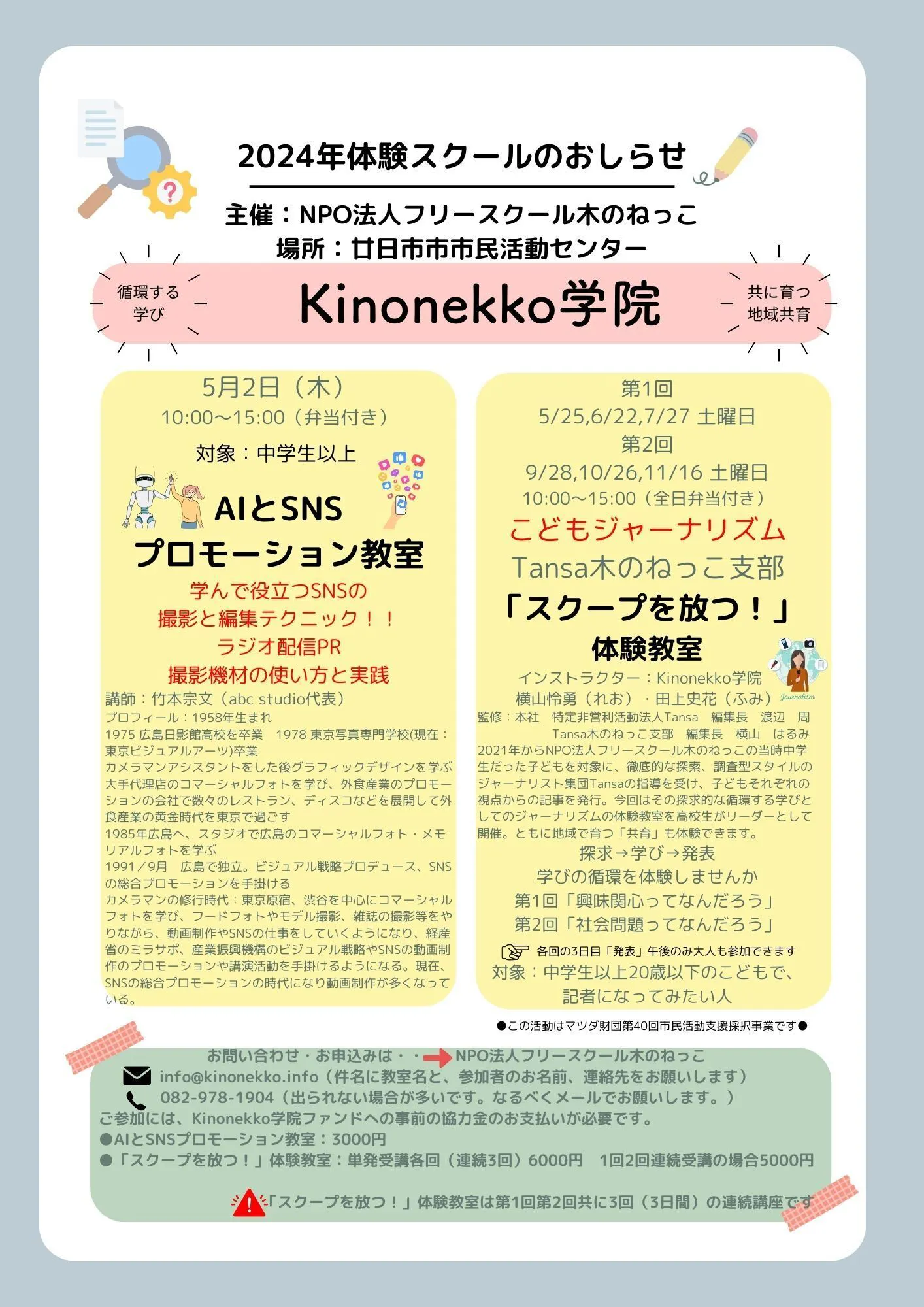 また5/2に 専門スタッフの竹本宗文(ハリー)さんが、AI/SNSプロモーション教室を開催します。ワンデイで、弁当付きの座学と実技があります。のんびり共に学ぶ気軽な教室です。