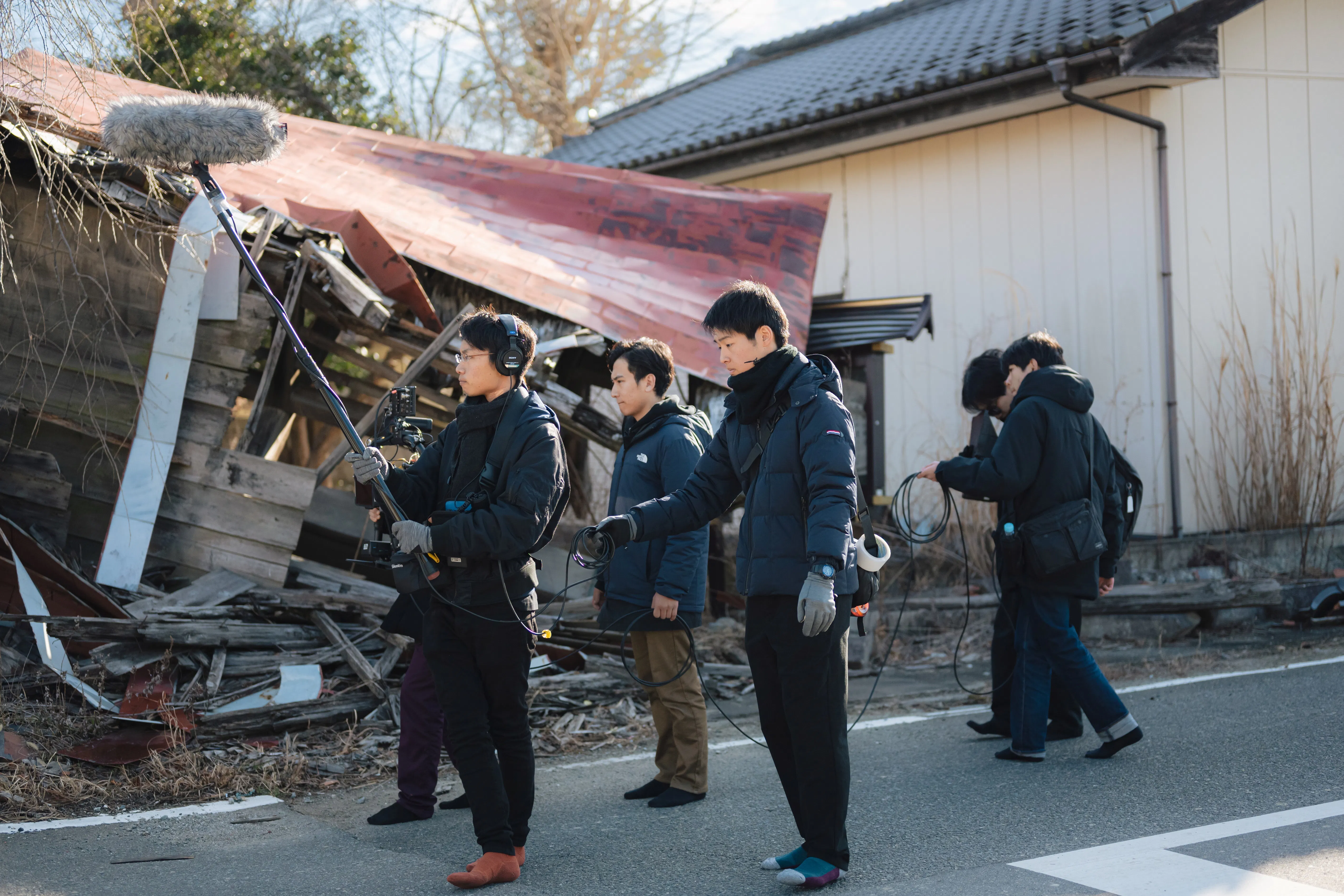 移動しながらの撮影で、録音に足音が入ってしまうため技術組はみんな靴を脱いでます。