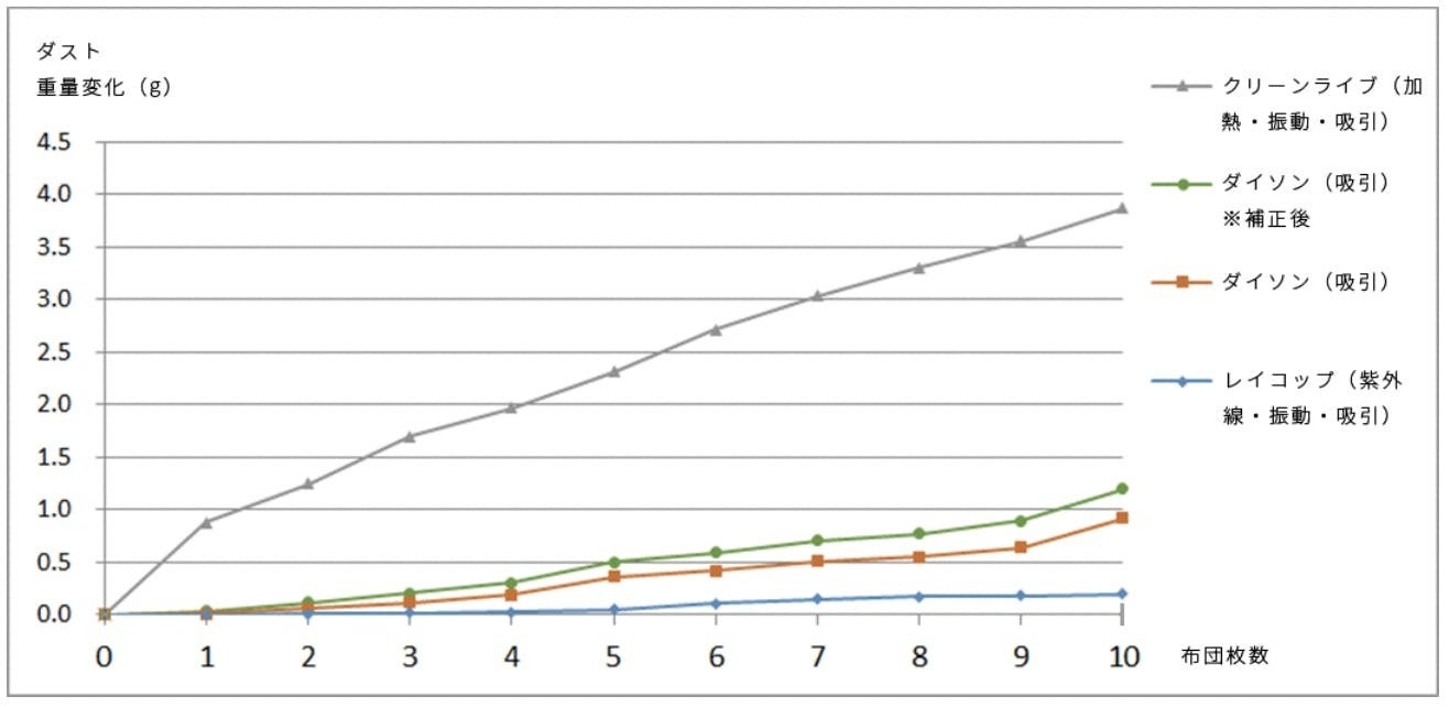 このグラフの灰⾊(クリーンライブと記載)線が寝具クリーニングの専⽤機械で除去したものになります。
