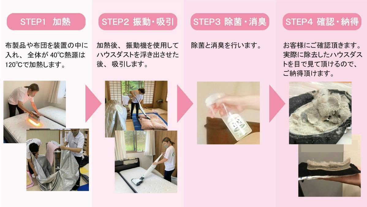 当サービスは水洗いをすることなく、機械の熱と特別な吸引器を使用することでマットレスやソファをはじめ、お布団や枕など様々な寝具をあなたの家の中で施工することが出来ます。