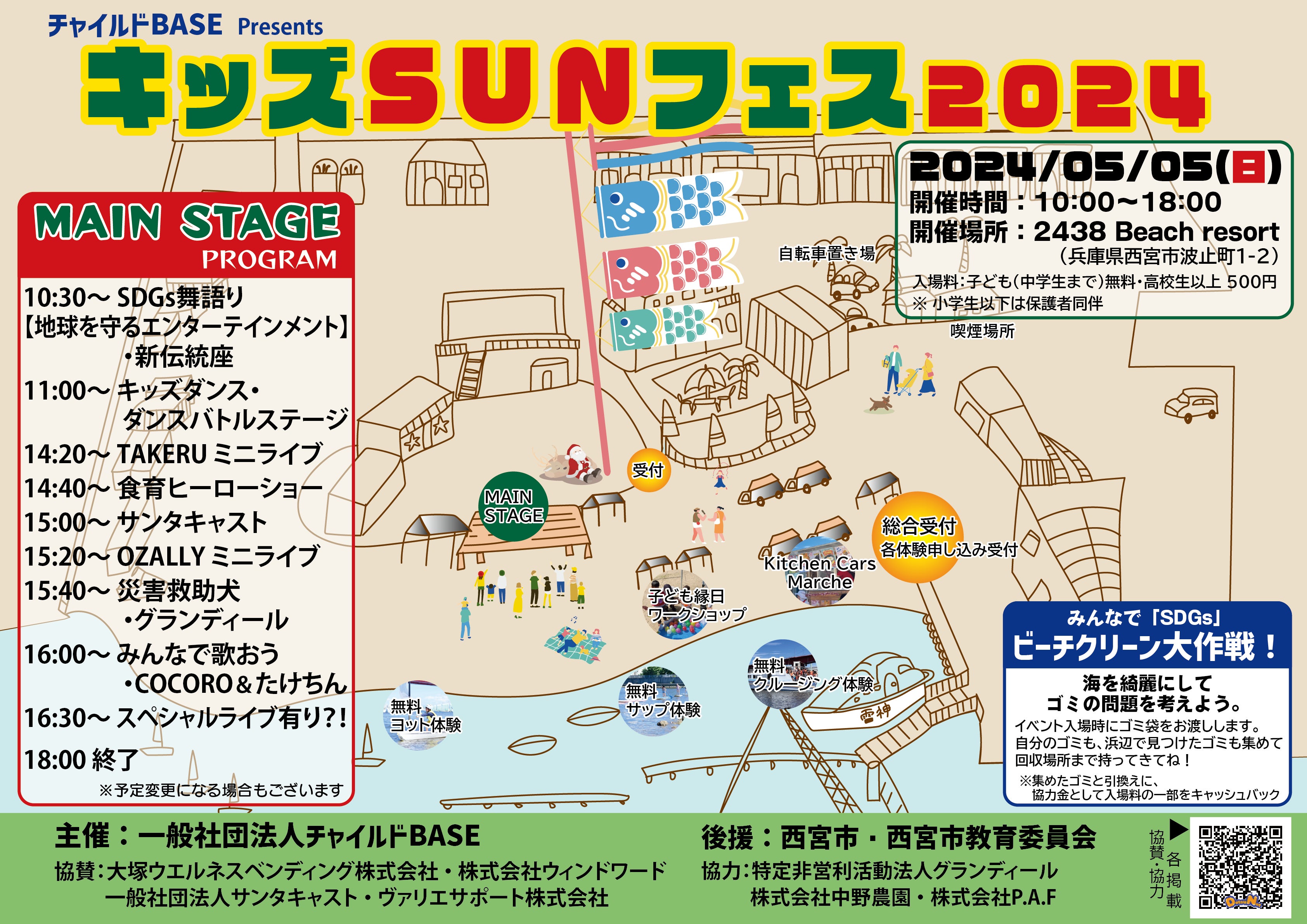「キッズSUNフェス」開催に向け、いつも応援していただきありがとうございます。今回もありがたいことに「西宮市」「西宮市教育委員会」の後援も頂き、「キッズSUNフェス 2024」のチラシが出来上がりました。このチラシも使い、今まで以上に地域の方や、周りの方々へ「SUNフェス」開催のアピールをしていきます。会場近隣の小学校・中学校の生徒さんに届くように配布の計画も進んでおります。チラシがあった方がお知り合いに広めやすいという方がおられましたら、お気軽にお問合せください。折り返し、メールにてチラシのデータを送らせていただきます。「未来の子供たちの為に大人たちが今できること」多くの方々のあたたかいご支援、ご協力に支えられながら、これからも皆様と一緒に前進し続けます。引き続き、ご支援・周りの人たちへの拡散など、ご協力をよろしくお願いいたします。