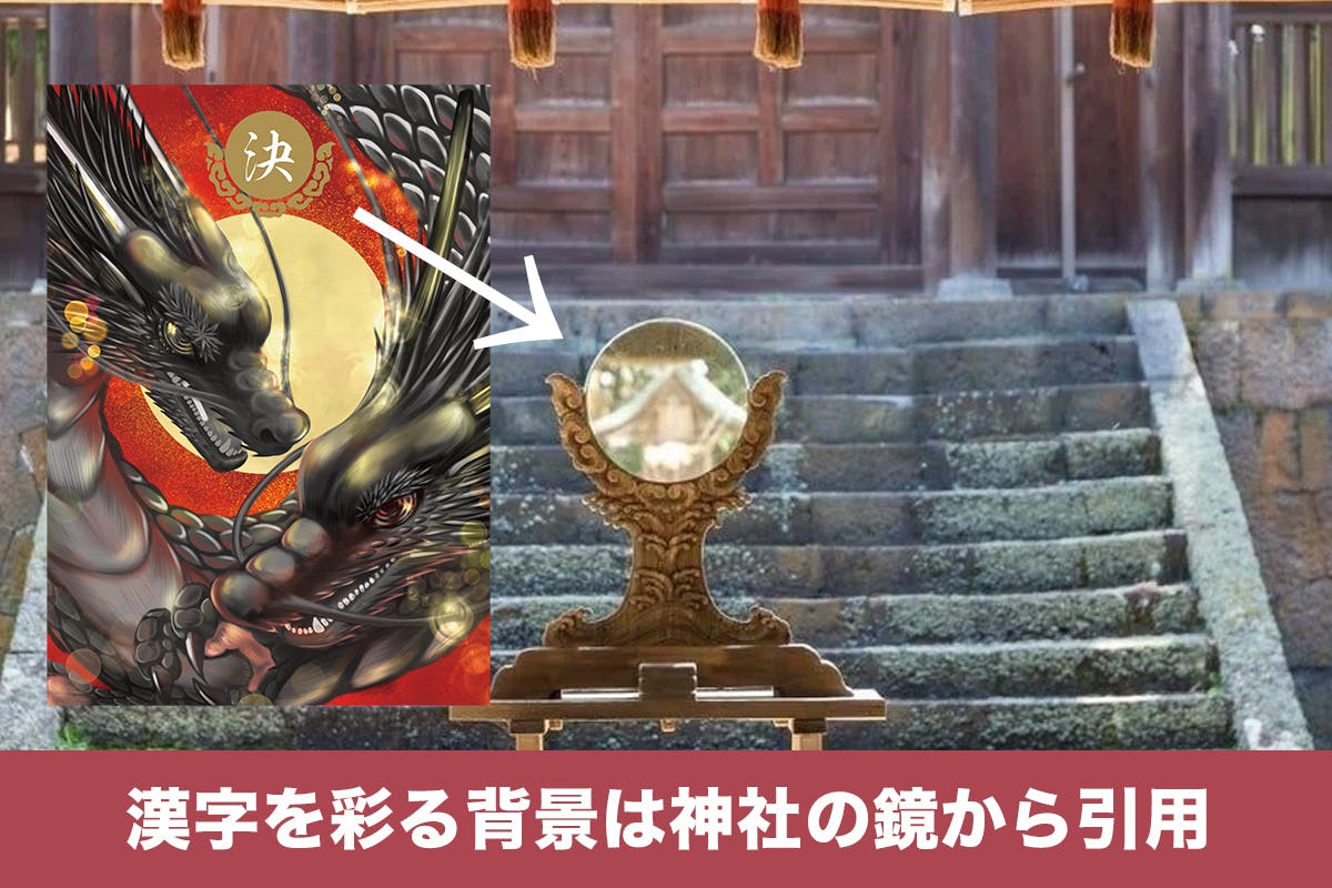 漢字が入る枠には、私たち自身の心を映し出すという、神社のご神鏡をデザインし、答えを映し出しています。