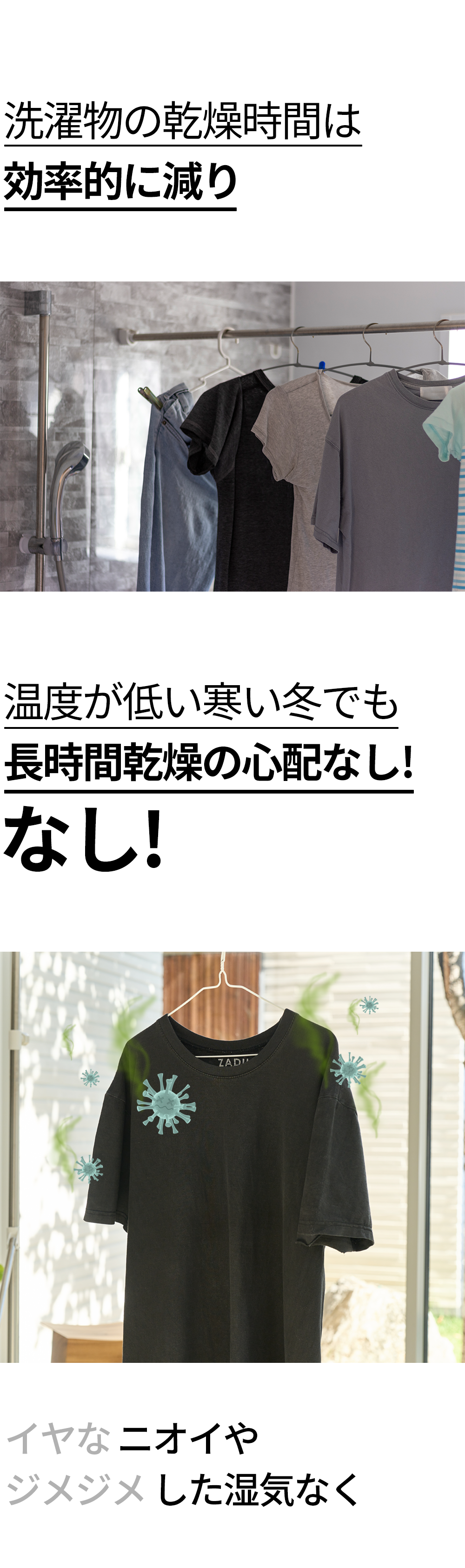 近所に工事現場がなかった時にも花粉や梅雨時など外干しができない時期には、室内干しで長時間乾燥させなければならない不便さや洗濯物からする臭い、菌などの心配、お風呂場の乾燥機を長い時間利用することによる電気代の心配など洗濯物の乾燥について色んな悩みを持っていました。