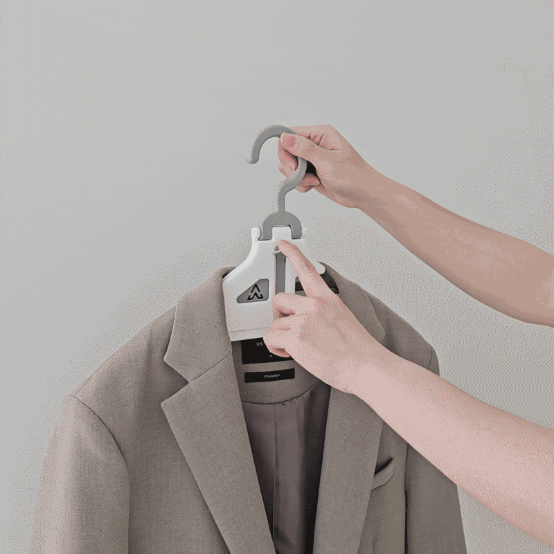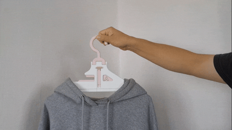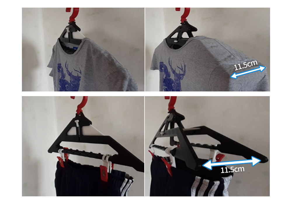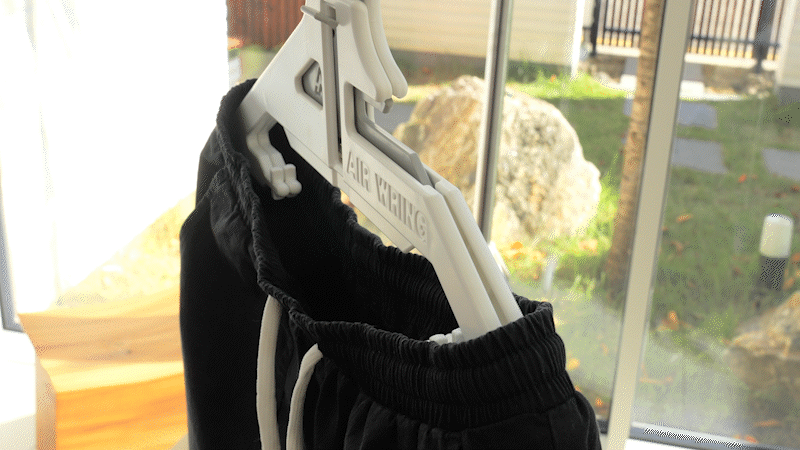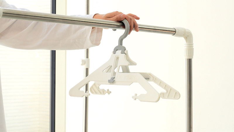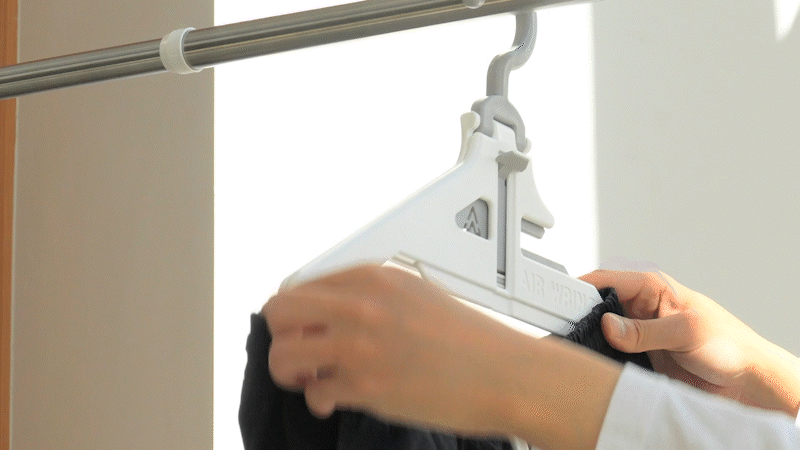 蝶番構造で簡単に服の中にスペースを作ることができ、ピンチを付けたり外したりするのもできるのでスカートやジョガーパンツも広げて乾かすことができます。もちろん、ピンチを外さない状態でも上着を乾燥させることができます。