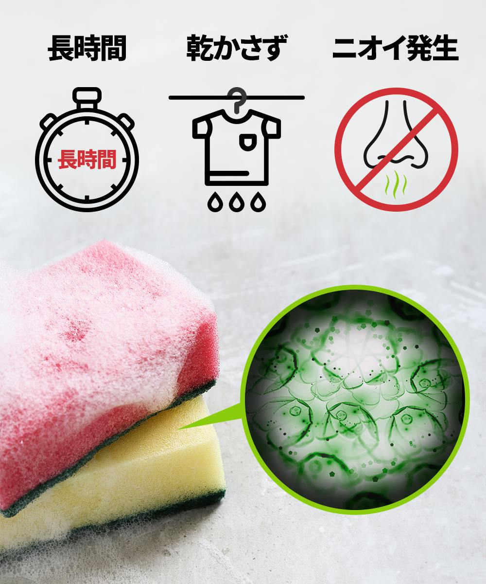 濡れた洗濯物や台所に置かれているスポンジなどからする悪臭は主に 「モラクセラ·オスロエンシス(Moraxella osloensis)」という菌が原因となります。この菌により、家の中のカビが増え、酷くなると頻繁な咳、慢性疲労、目と首の痛み、頭痛、皮膚のかゆみなどの症状にもつながるようです。