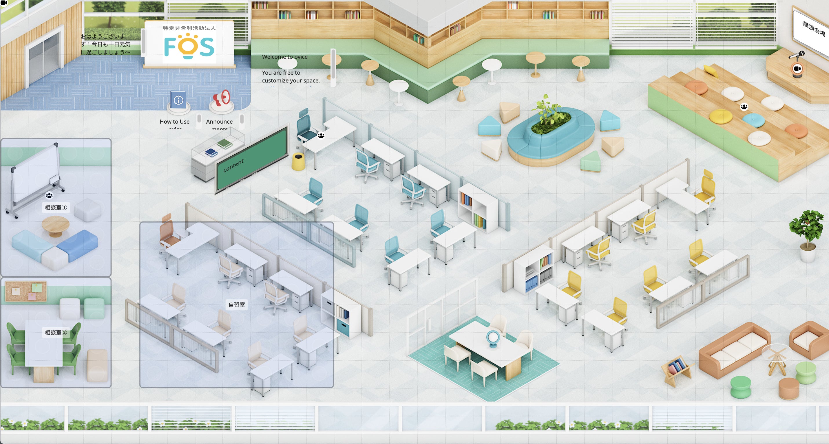 私たちのプロジェクトのこだわりは、「無料」で使えること、そして「メタバース空間」を活用することです。教育は、本来ならば誰もが無料で受けられるものです。学校に行けなくても、教育の機会・交流の場が失われることのないよう、フォスペースを無料で提供したいと考えています。またメタバース空間を使うことで、実世界に近い形での交流を可能にしながら、誰もが気軽にアクセスできるようにしたいと思っています。