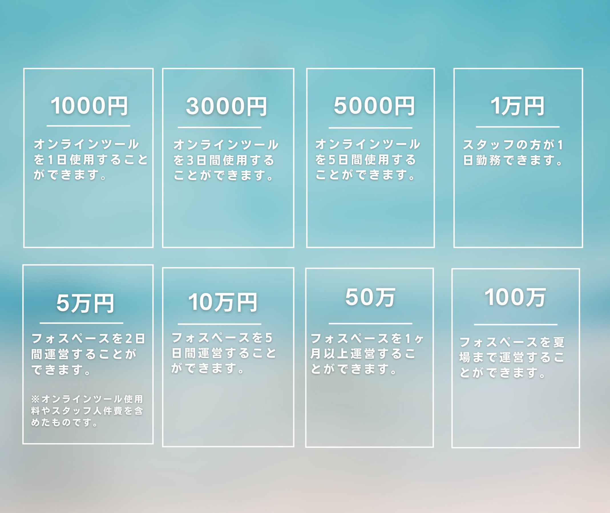 みなさまからご支援いただいた資金は、フォスペースの運営費やスタッフの人件費に充てさせていただきます。