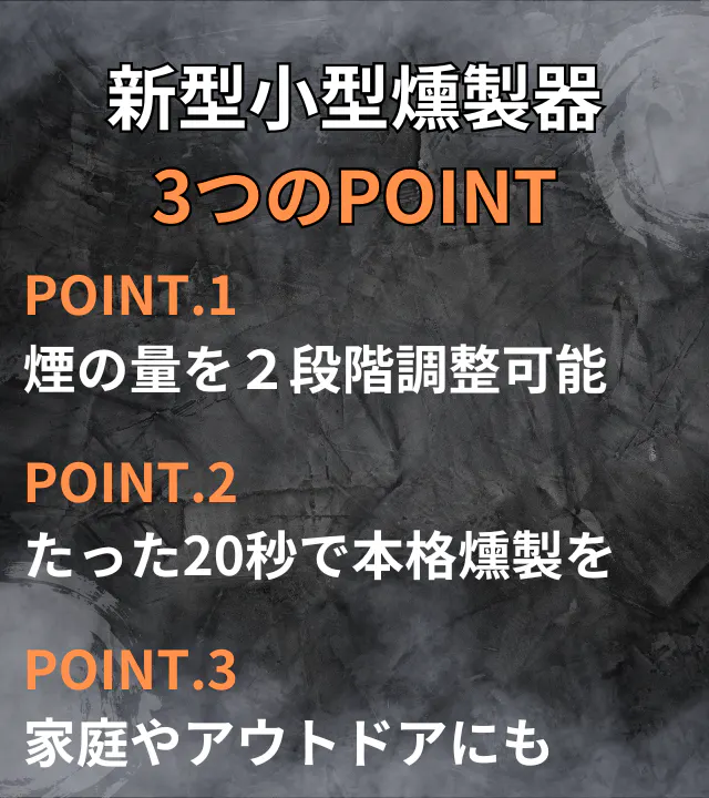 コンパクトなのに家庭用では十分すぎるくらいの煙の量で本格燻製を楽しみいただけます。本格的な燻製器で作る燻製ももいいですが、少しの時間で気軽に燻製を楽しみたい!そんなあなたにおすすめです。