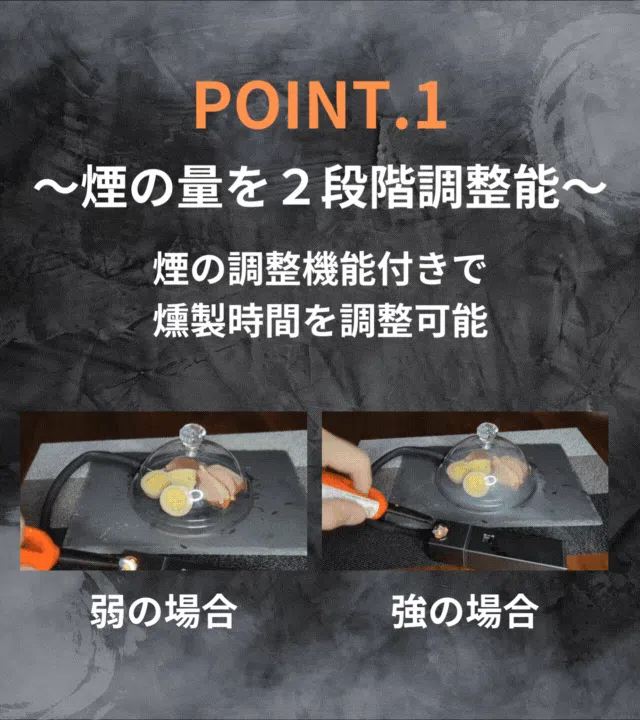 じっくり燻製を楽しみたい方は「弱」、短時間でしっかり香り付けをしたい方は「強」で燻製を楽しんでいただくことができます。