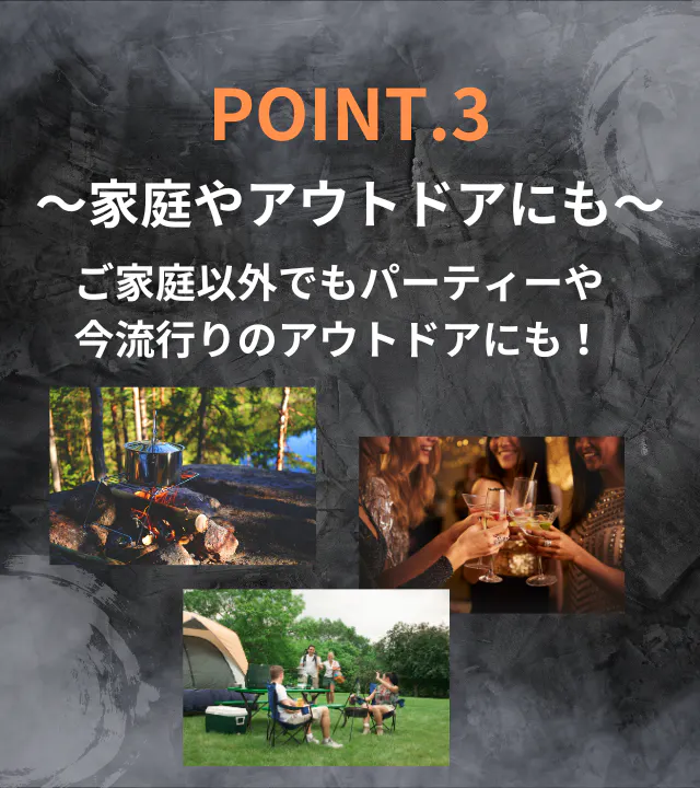最近流行りのキャンプでも活躍!手のひらサイズなので荷物になりづらく、小型で携帯性◎。ちょっと燻製を楽しみたいと思ったらすぐに燻製を楽しむことができます。