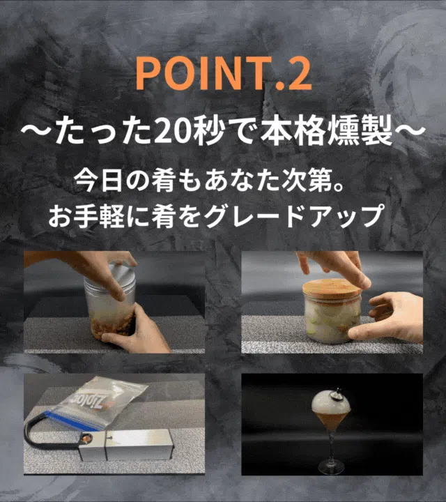 ナッツや枝豆、鴨肉のローストなど様々な食材を燻製することができます。また、普段のウイスキーやカクテルにも香りをつけることができ、いつもの1杯をグレードアップ!