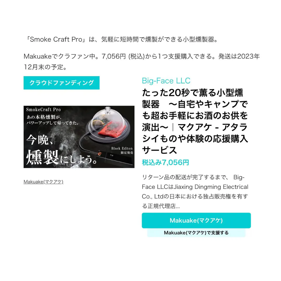 料理にひと手間、燻製料理が手軽にできる「Smoke Craft Pro」として「未来を感じる動画メディア」bouncy(バウンシー)にも掲載されています。