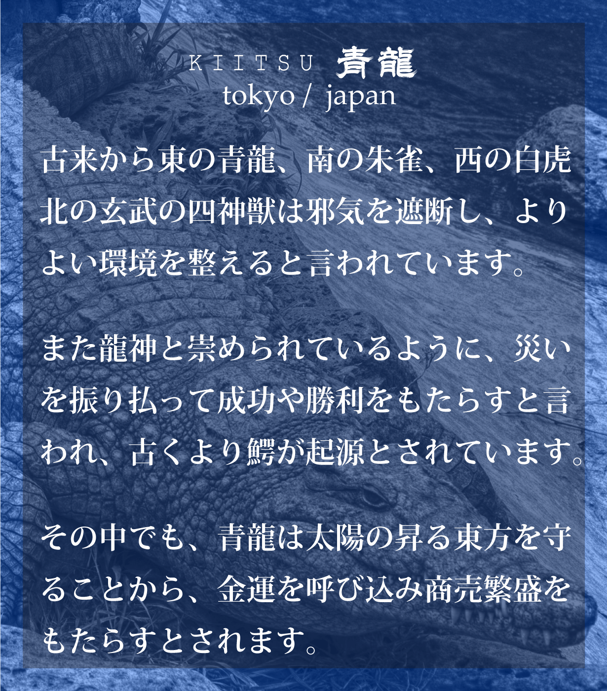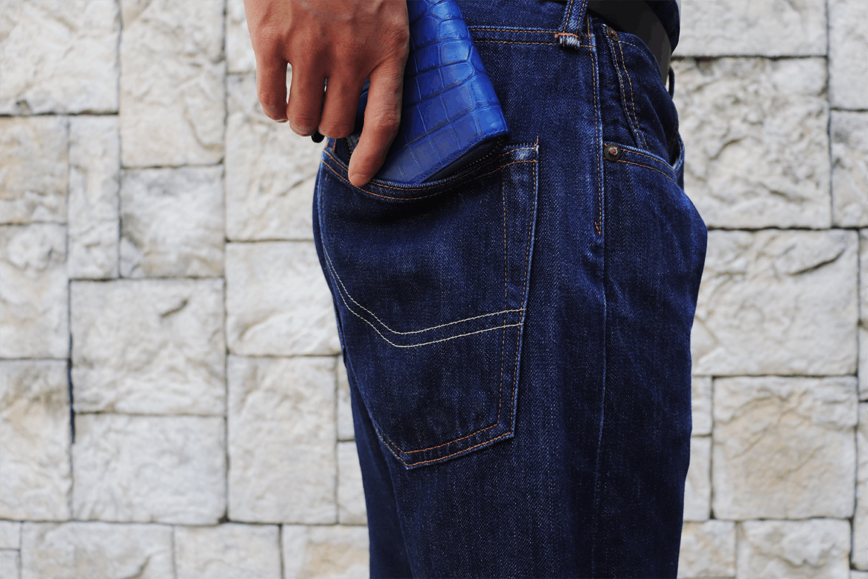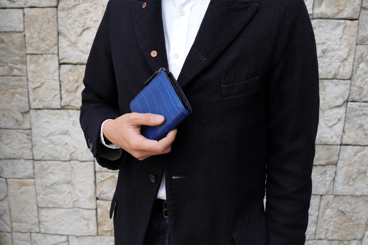 ※本文中にも記載しておりますが、製品によって色味、斑模様が異なります。本製品のクロコダイル使用部位については、原則として外装は腹部や顎部分を使用しています。また内装のカードポケットには尻尾部分を使用しています。生き物から頂いた革を端から端まで余さず取り切るため、向きや角度を考慮して熟練のエキゾチックレザー職人自ら裁断を行なっています。その為、斑模様や斑サイズ、竹斑と丸斑バランス、クロコダイルの個体サイズ、使用部位、縦や横の裁断方向、色味、その他も含む個別の指定はできかねます。予めご了承くださいませ。