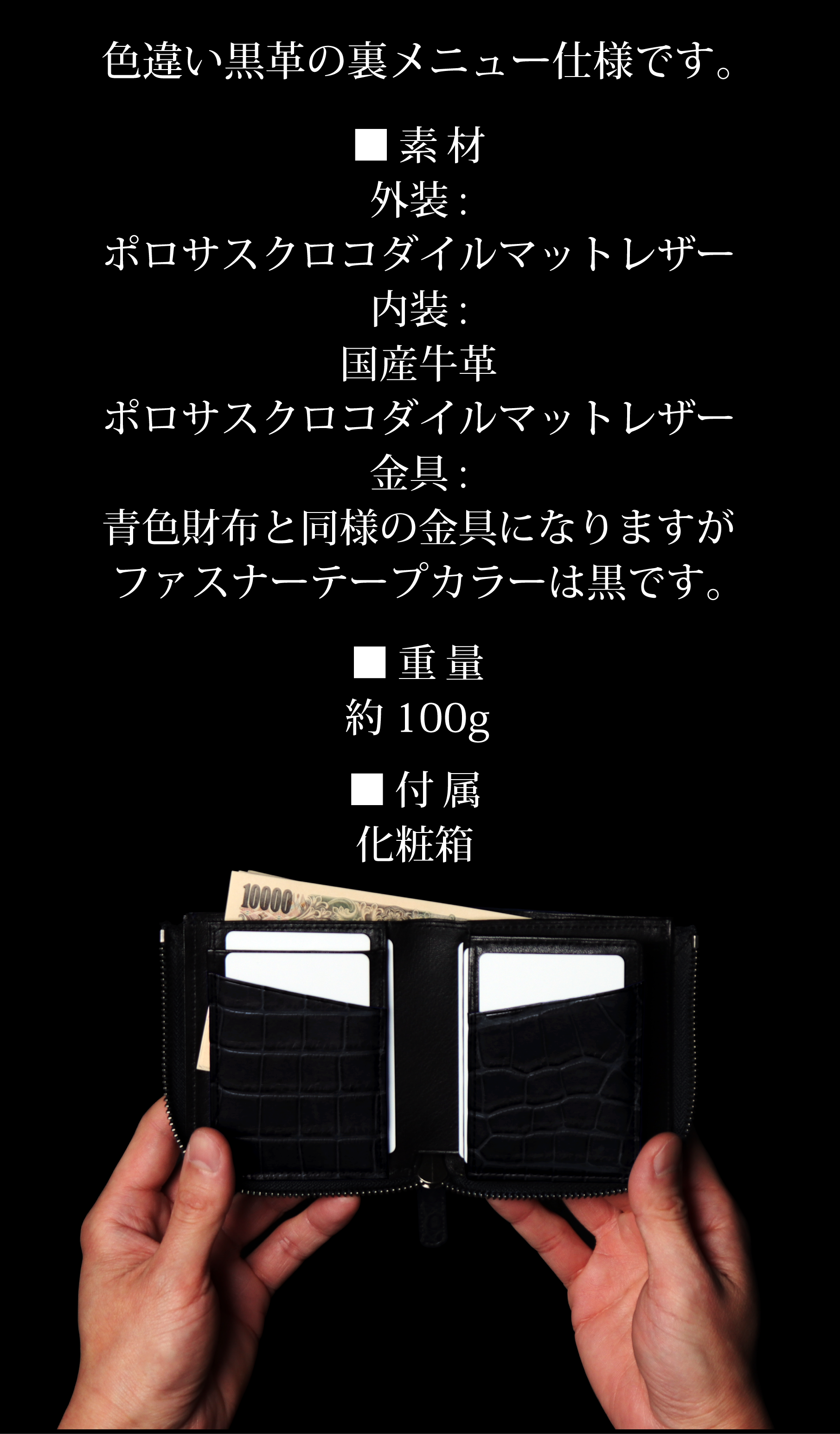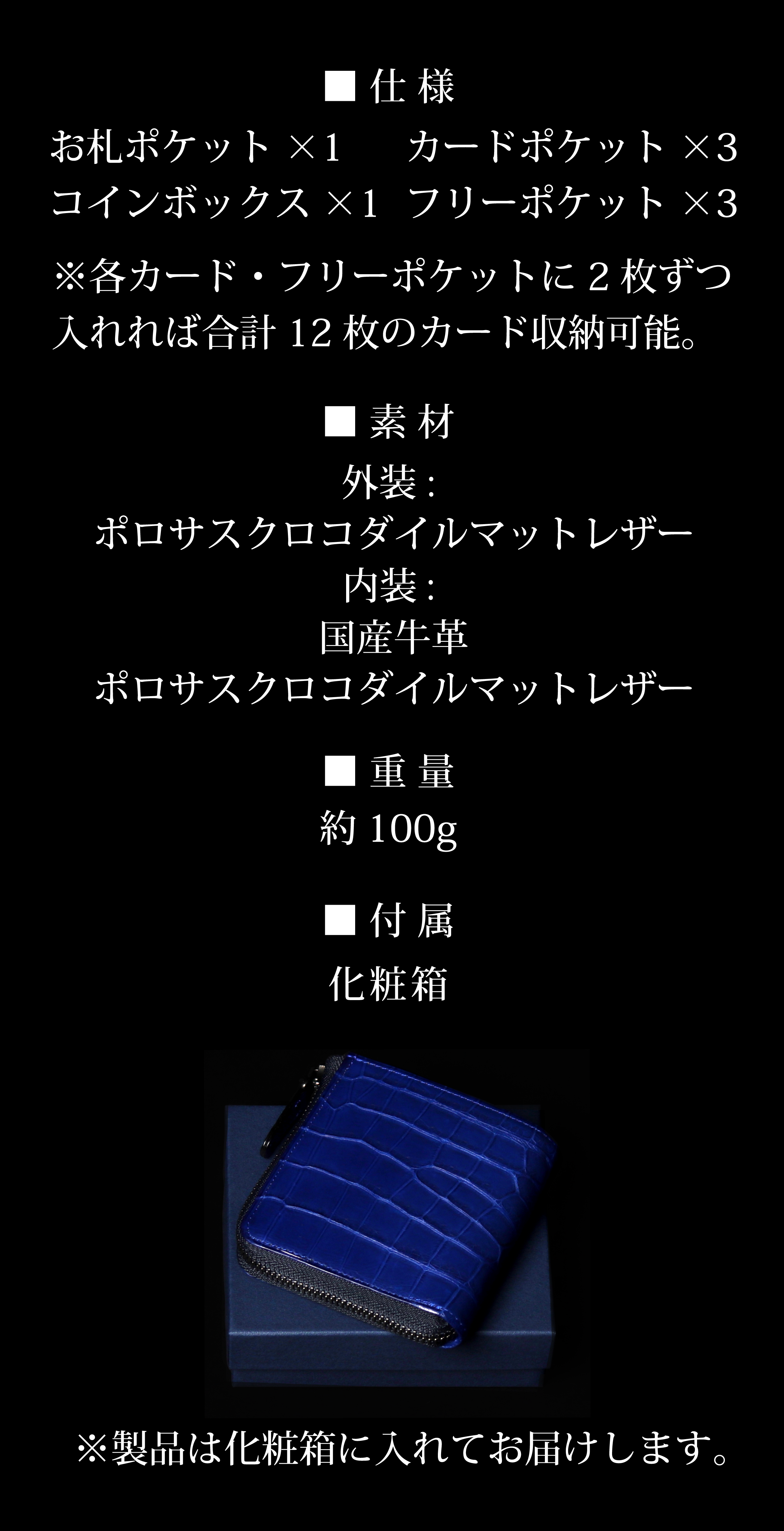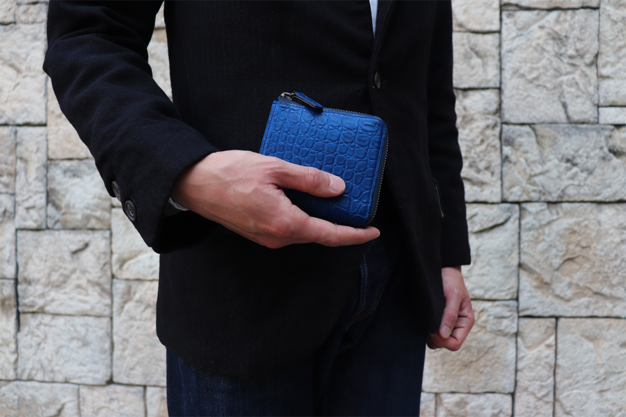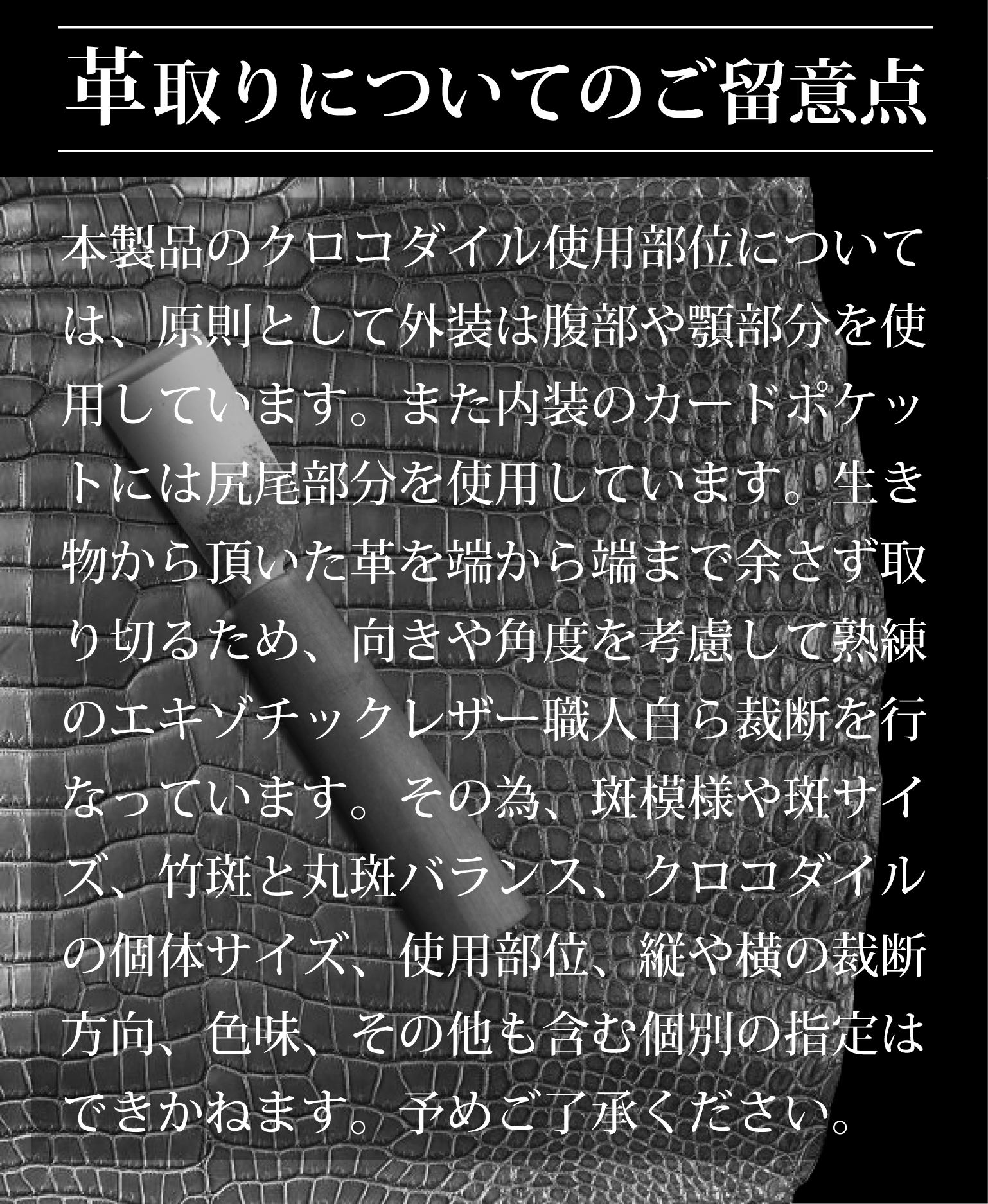 ※本文中にも記載しておりますが、製品によって色味、斑模様が異なります。本製品のクロコダイル使用部位については、原則として外装は腹部や顎部分を使用しています。また内装のカードポケットには尻尾部分を使用しています。生き物から頂いた革を端から端まで余さず取り切るため、向きや角度を考慮して熟練のエキゾチックレザー職人自ら裁断を行なっています。その為、斑模様や斑サイズ、竹斑と丸斑バランス、クロコダイルの個体サイズ、使用部位、縦や横の裁断方向、色味、その他も含む個別の指定はできかねます。予めご了承くださいませ。