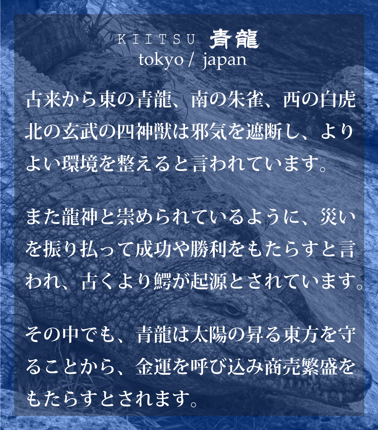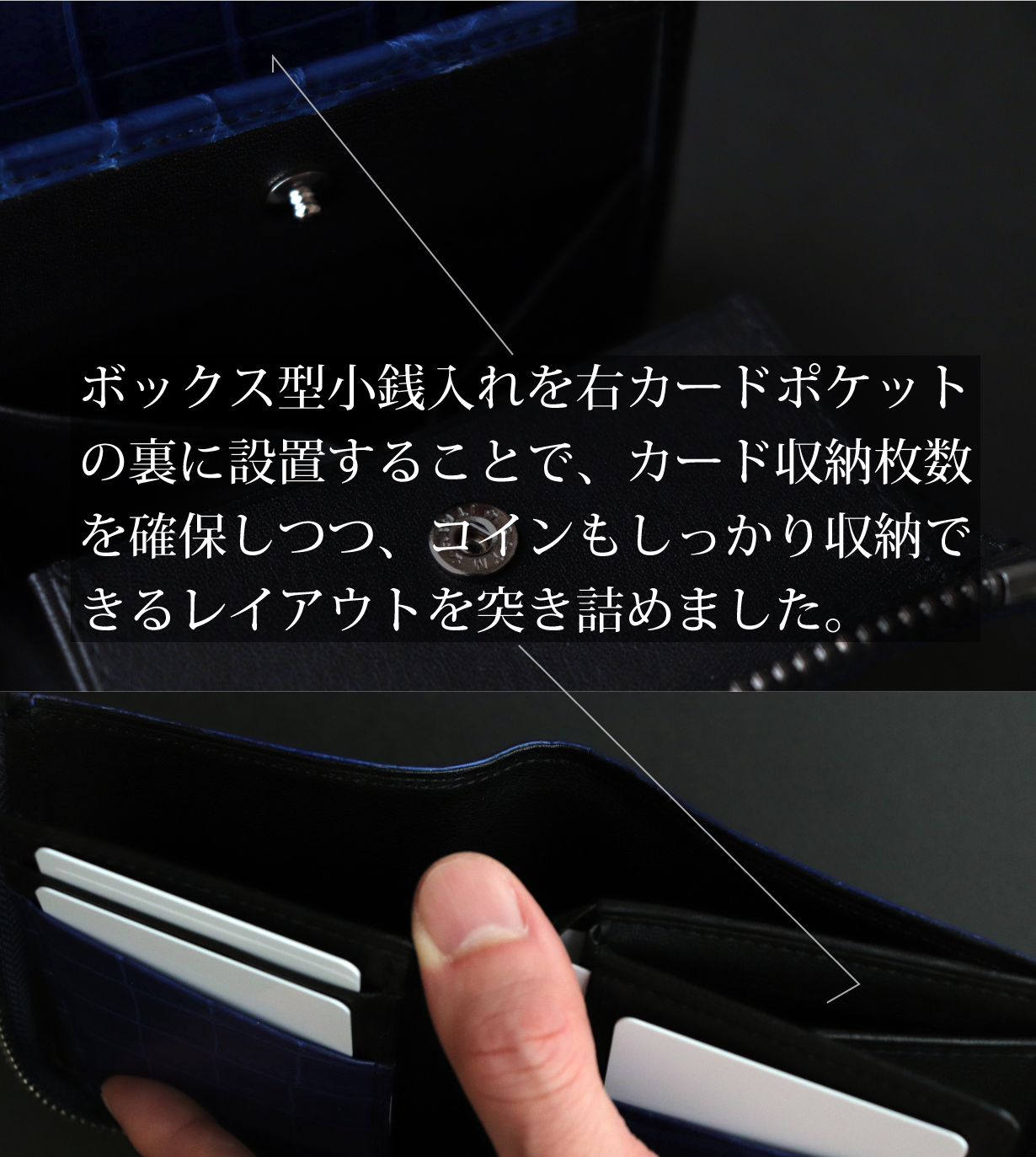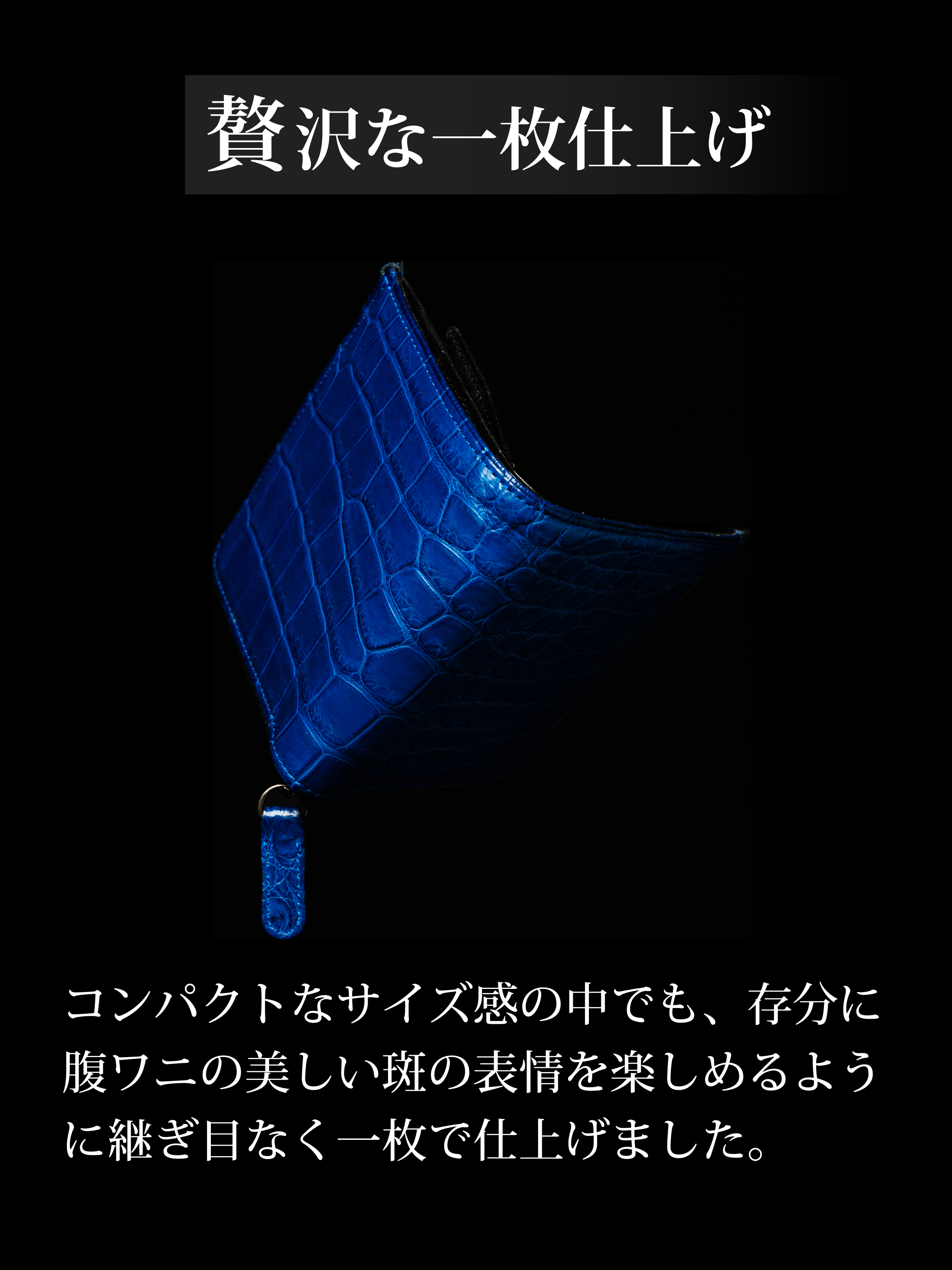 ※本文中にも記載しておりますが、製品によって色味、斑模様が異なります。本製品のクロコダイル使用部位については、原則として外装は腹部や顎部分を使用しています。また内装のカードポケットには尻尾部分を使用しています。生き物から頂いた革を端から端まで余さず取り切るため、向きや角度を考慮して熟練のエキゾチックレザー職人自ら裁断を行なっています。その為、斑模様や斑サイズ、竹斑と丸斑バランス、クロコダイルの個体サイズ、使用部位、縦や横の裁断方向、色味、その他も含む個別の指定はできかねます。予めご了承くださいませ。