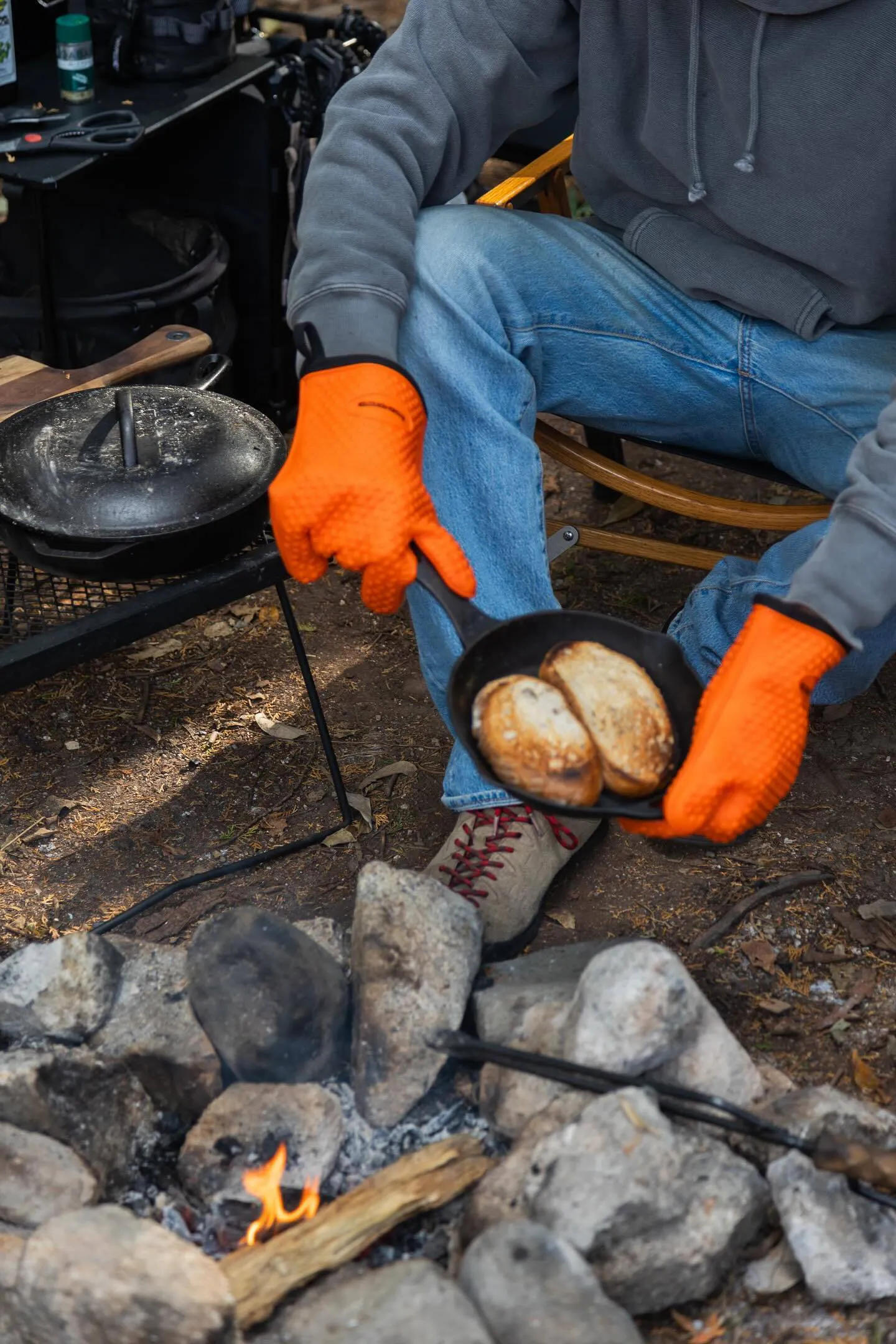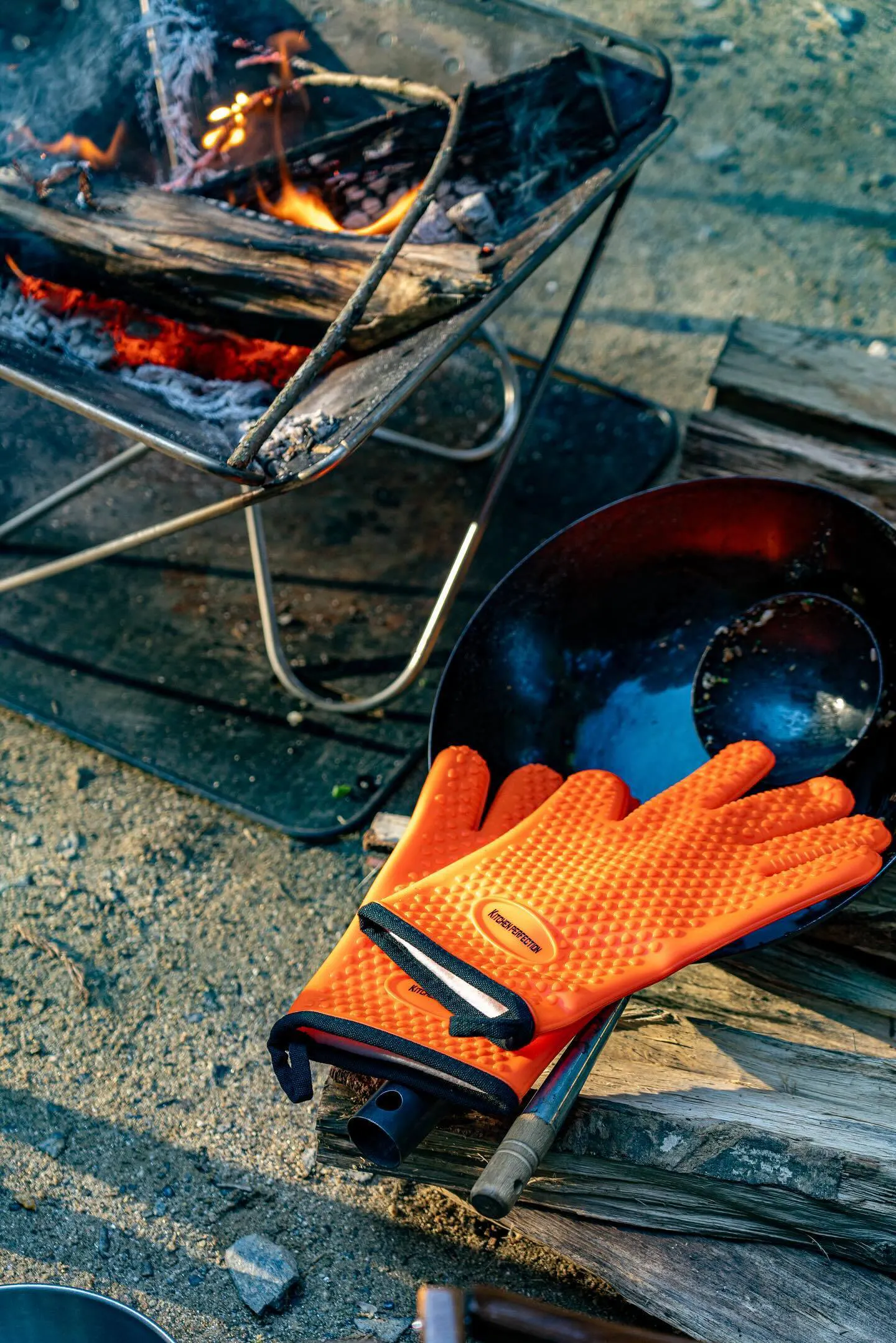 焚き火から手を守ったり、調理時にフライパンや鍋、スキレット、トングなど熱くなった物をつかめる手袋のことです。
