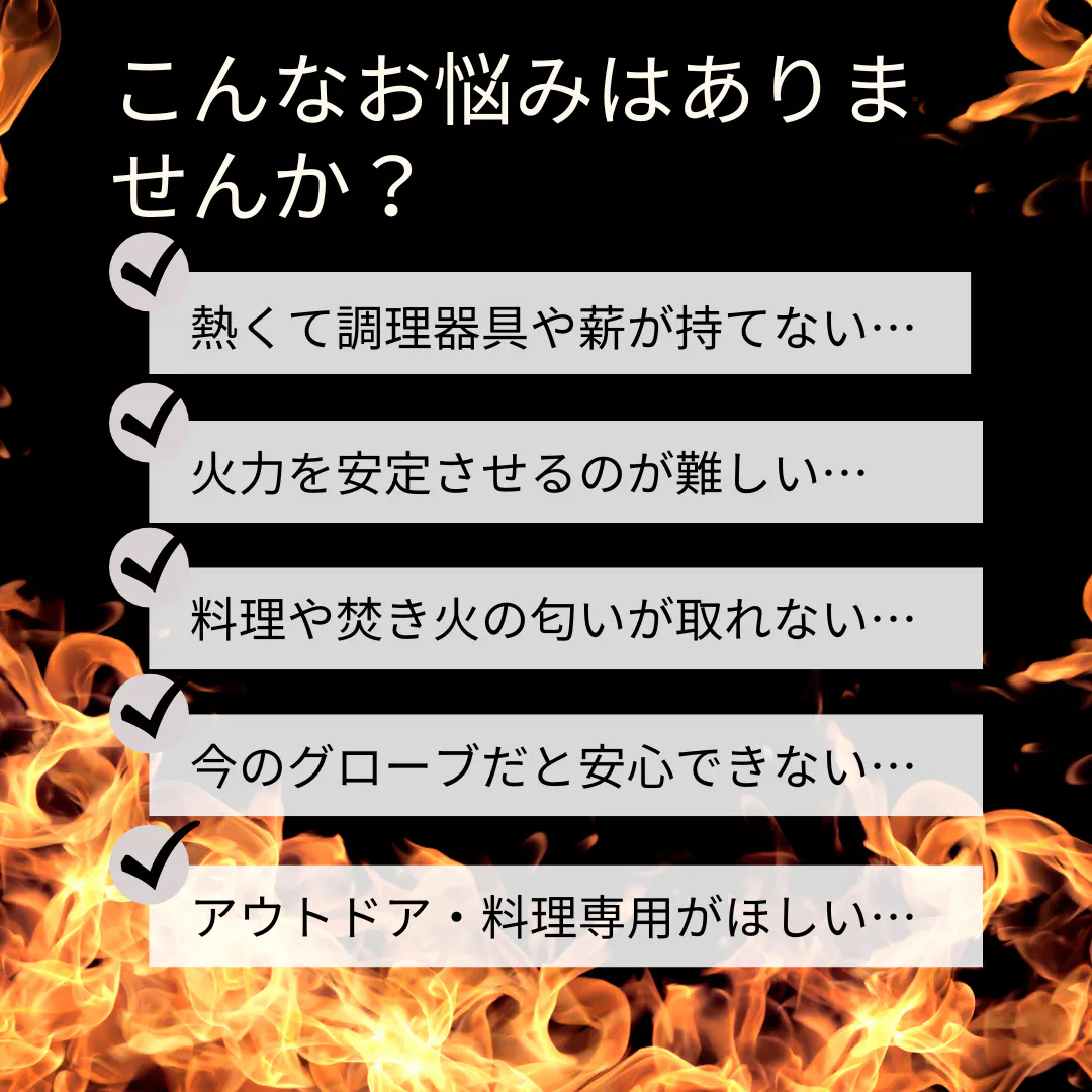 アウトドア・加熱調理で使うグローブは、焚き火やBBQで火を扱うことを考えると、「耐熱性が高い」のものを選ぶのが基本です。