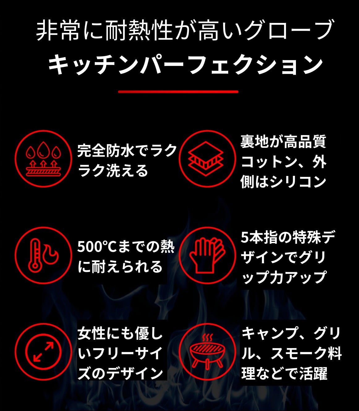 屋内のストーブの上や、屋外のバーベキューガスグリルで起こる熱の危険から守れる優れたグローブです。