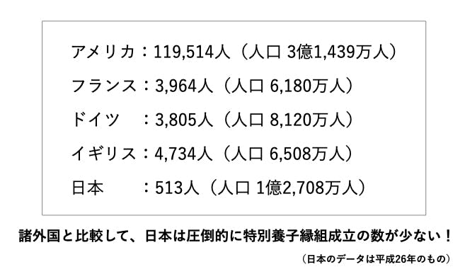 また、こちらは国の人口に対する特別養子縁組(海外では養子縁組)の成立人数を示した表です。これを見ると日本での成立数が諸外国と比べて圧倒的に少ない事実が分かります。