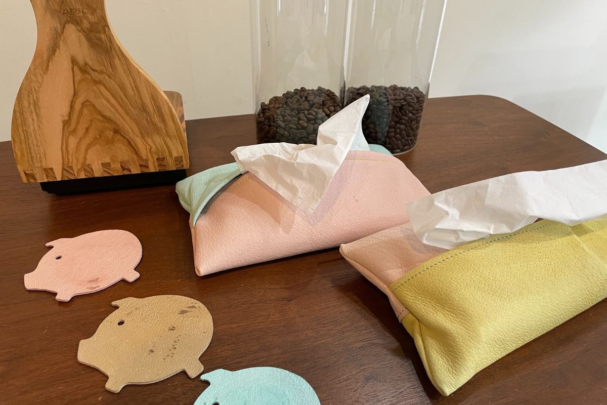 ●お店の備品(コースターやティッシュケースなど)もピッグレザー製