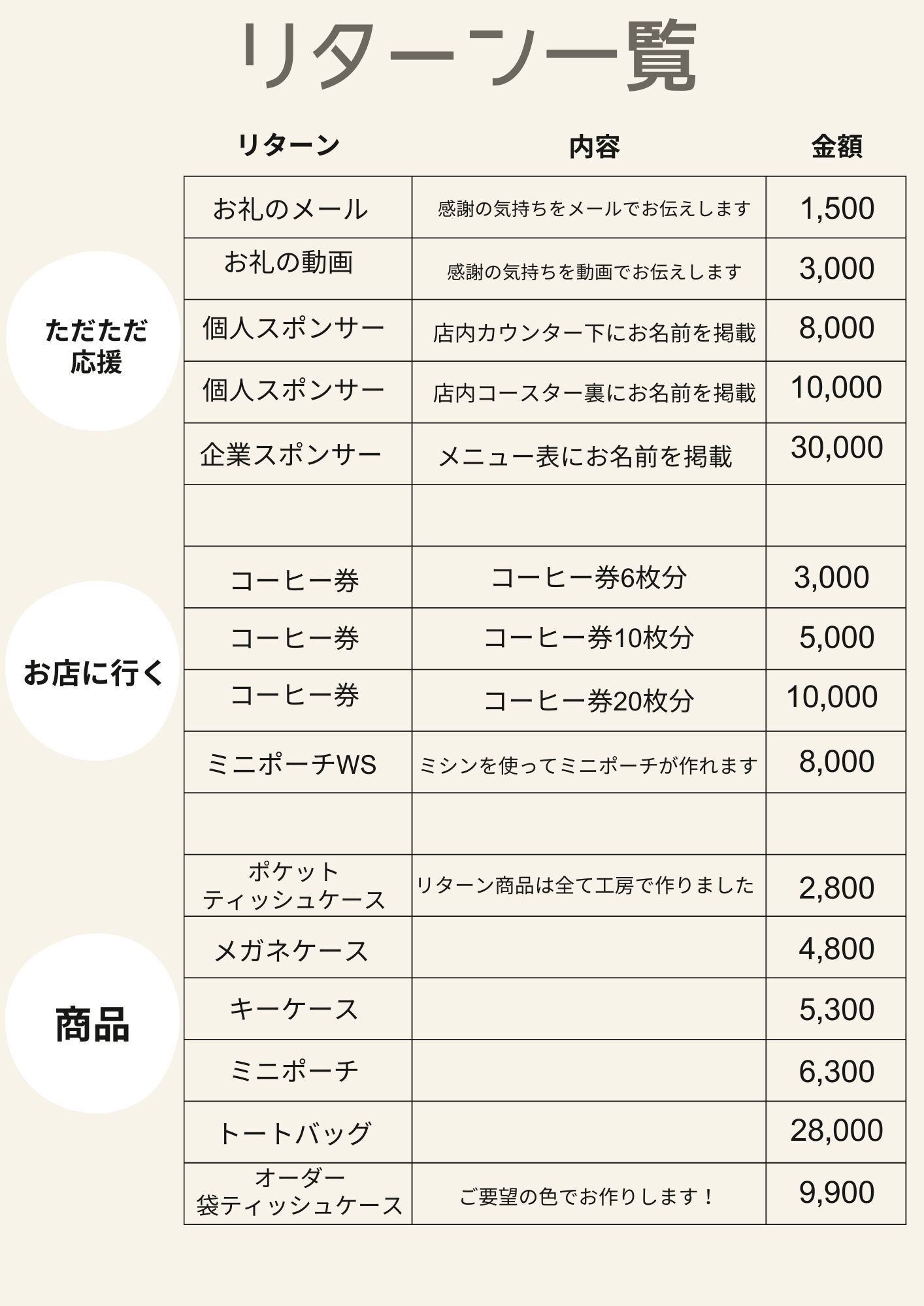 大きく分けて、3種類のリターンをご用意しました。