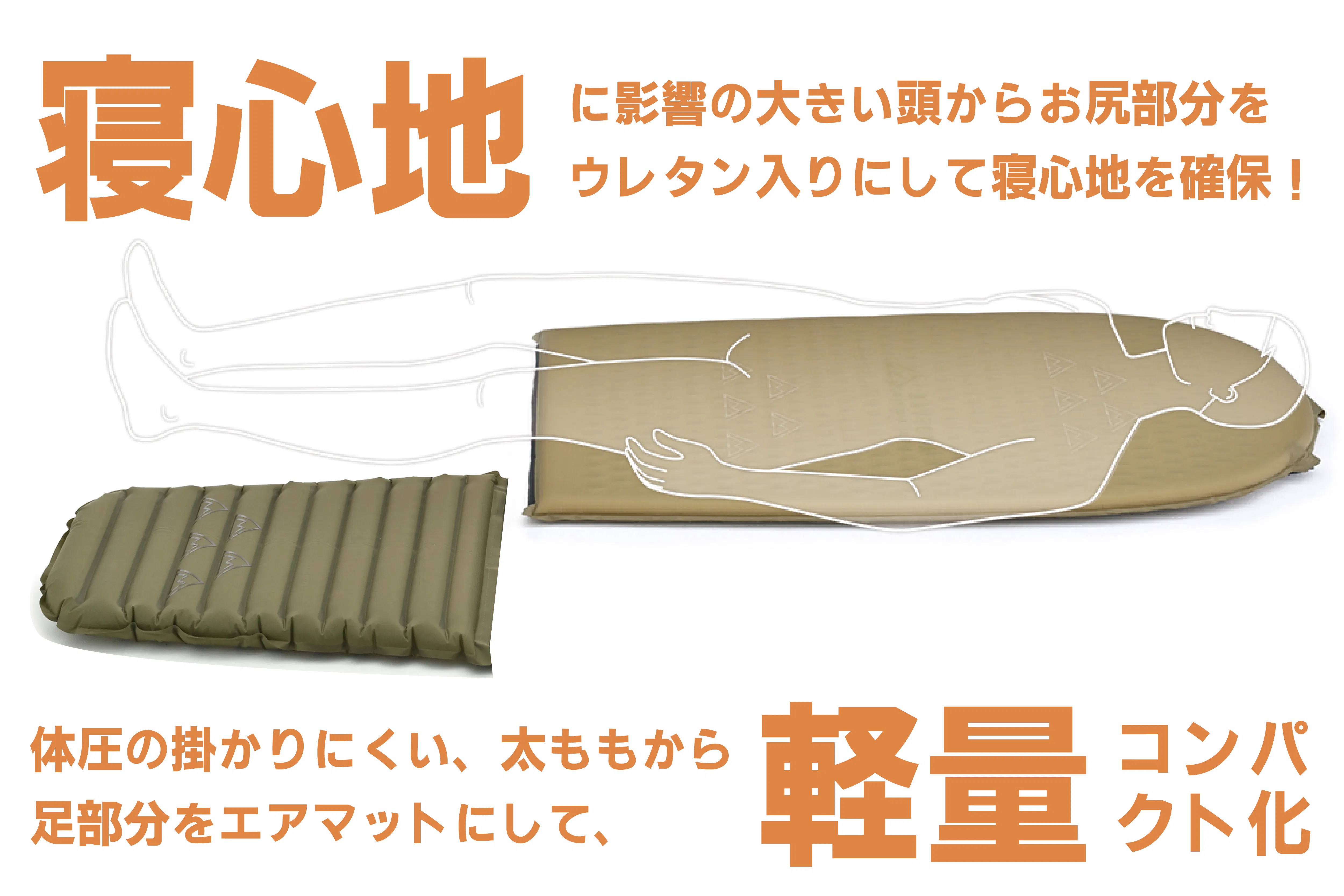 収納だけを考えればコンパクトになるエアーマットが一番なんですが、寝心地はいまいち。かといって全てをウレタンにするとかさばり、重くなってしまいます。寝心地で重要なのが、背中からお尻が乗る部分の快適性。そこでマットの上部をウレタンマットにし、寝心地に影響が少ない足元はエアーマットにする前作同様の構造にしています。