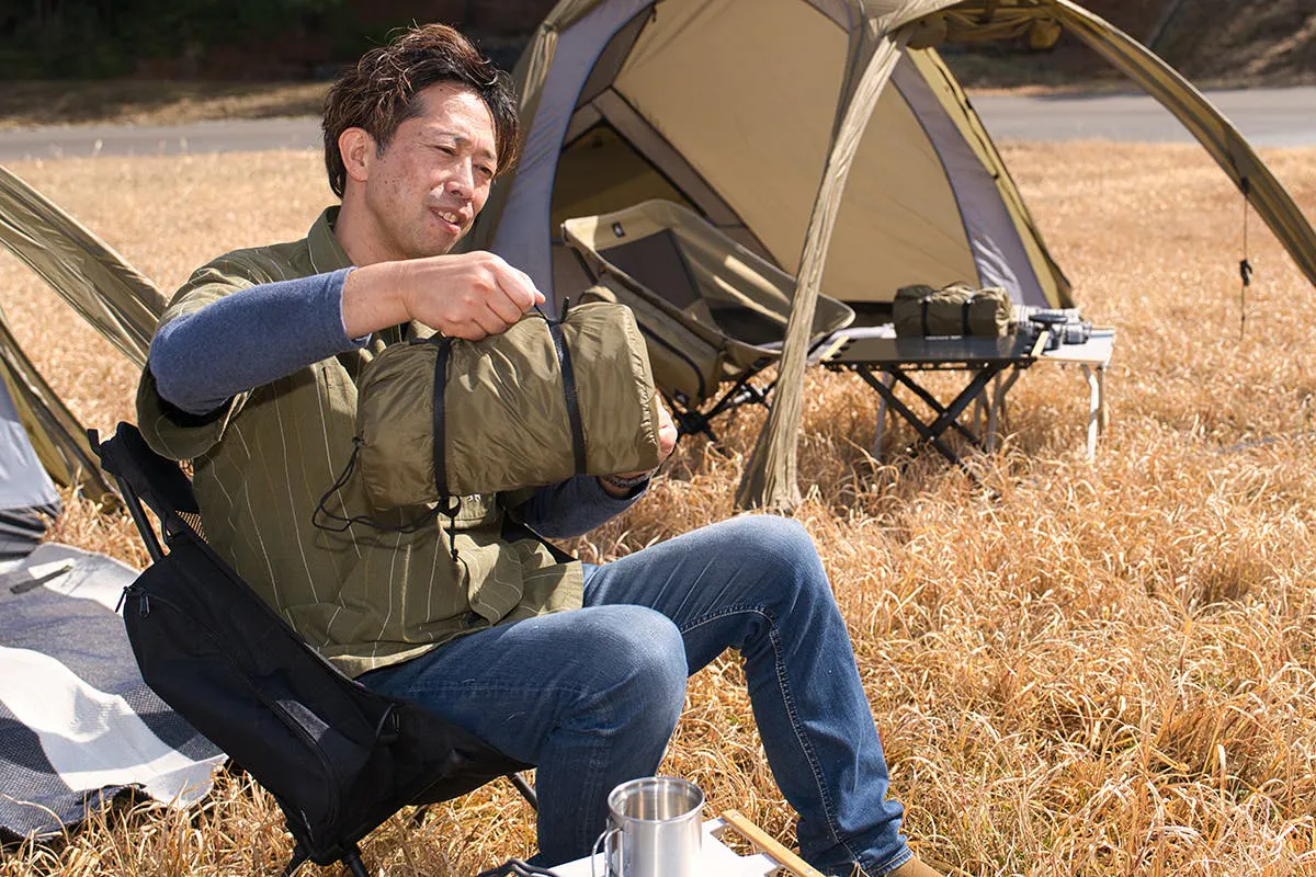 分離することで、エアーマットをイスのクッションや座布団代わりに使える、うれしいメリットも生まれました。これまで寝る時にしか使わなかったマットが、日中も活躍するようになったんです。足側のエアーマットを持っていかなければ、さらにコンパクトに持ち運ぶこともできます。