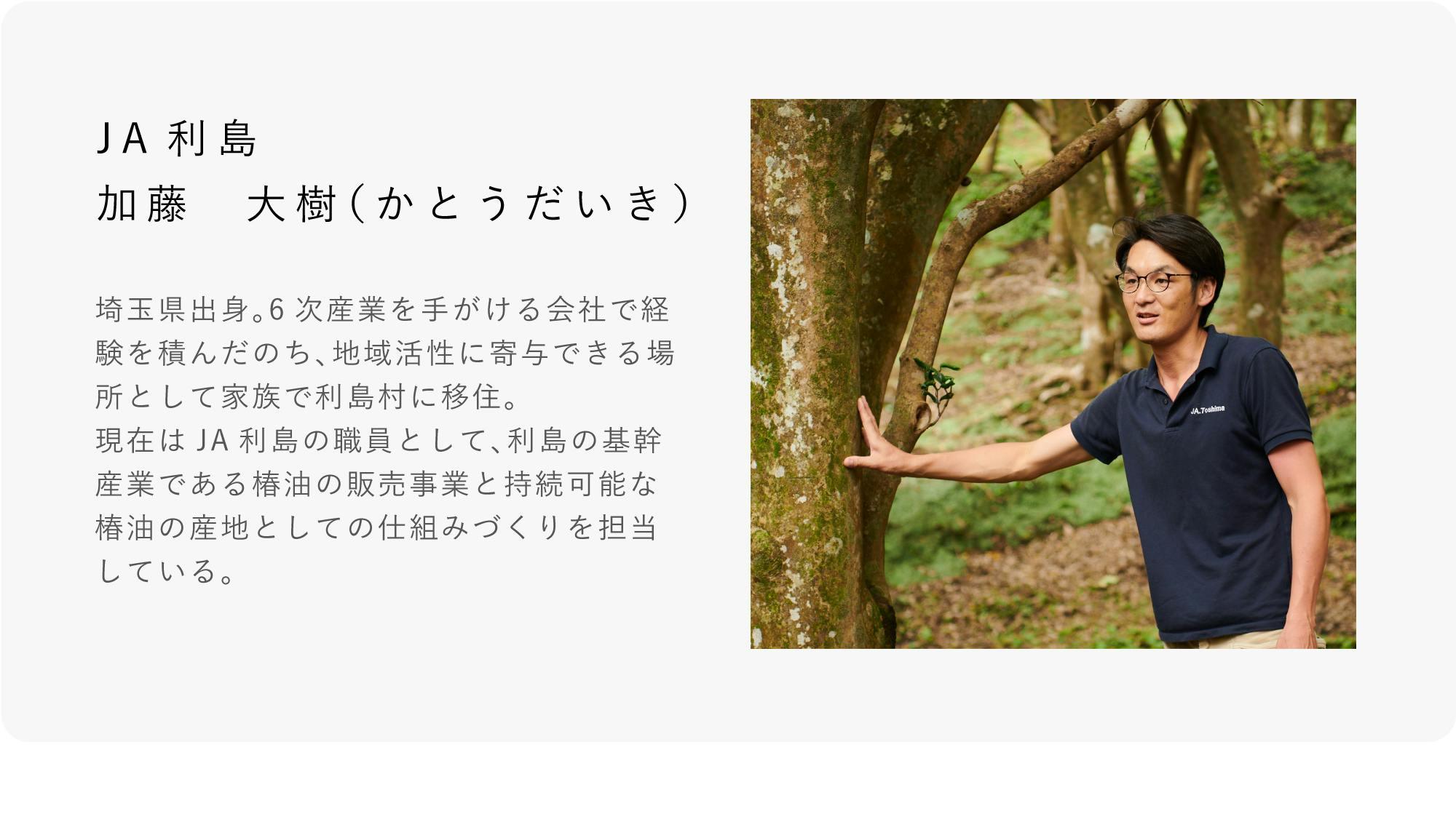 島に古くから根付く"循環"の価値観を体現したツバキ種子エキスを使った商品が、より多くの方に届き、神代椿や利島を知っていただくきっかけとなったら幸いです。