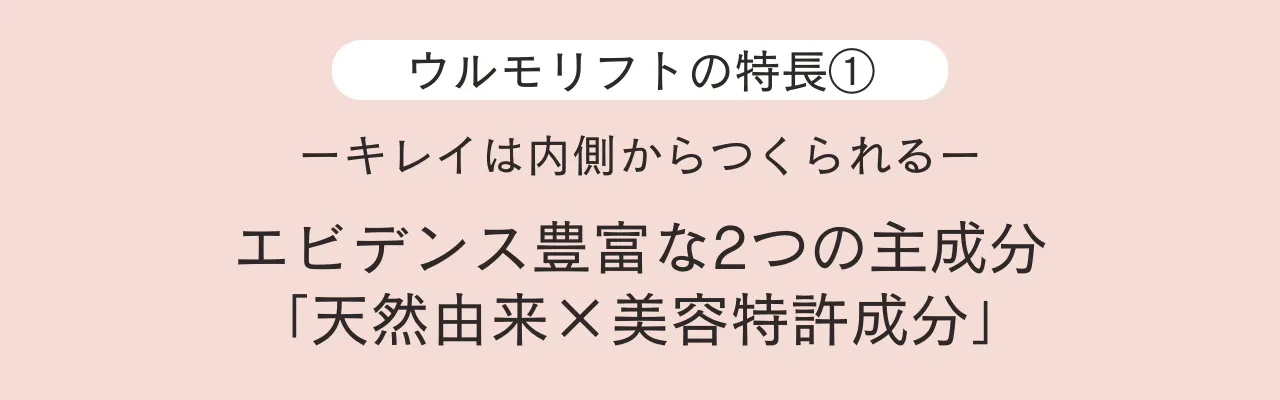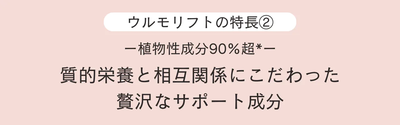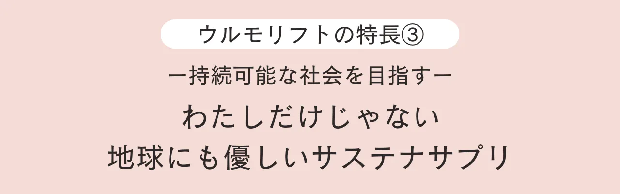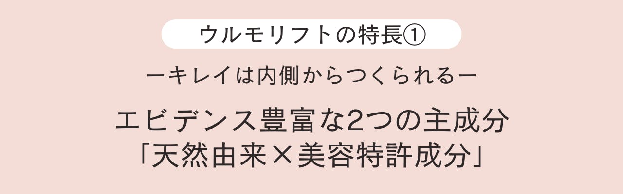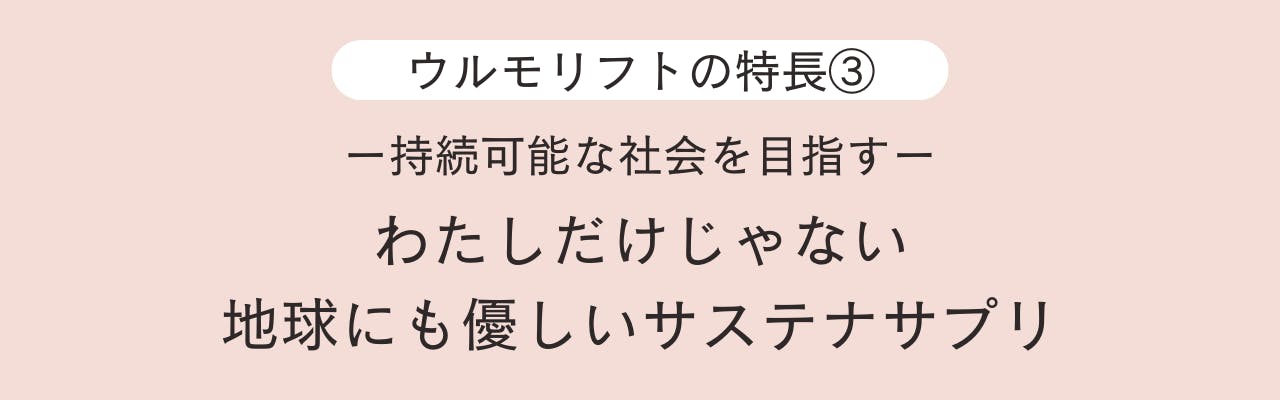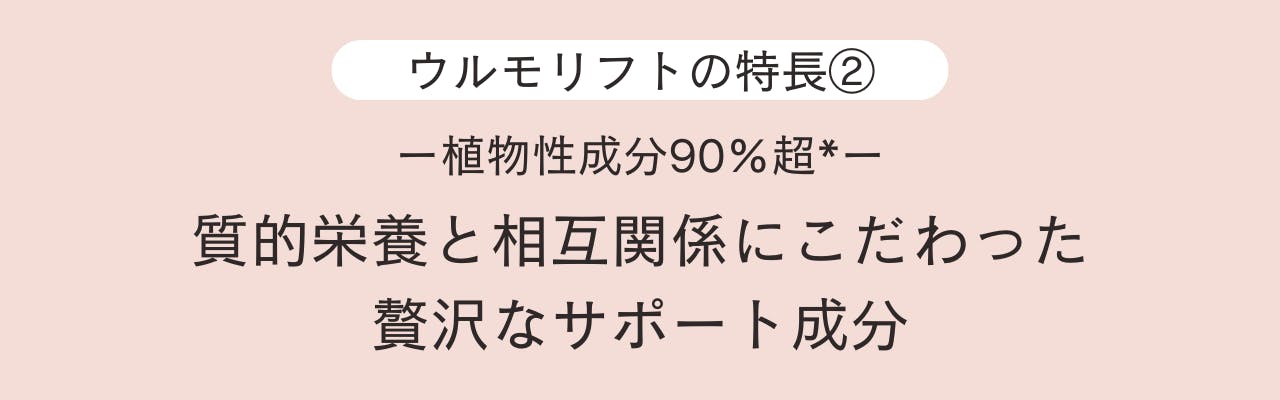 症状に対する対処というアプローチではなく、美肌や健康の根幹となる自分自身のカラダを整え、健やかに美しくいたい、ハリ・潤いのある未来を過ごしたい、そして私たちやその子供たちが生きていく環境を少しでも良い形にしていきたいと思う方々に、W(ダブル)の天然由来土台成分を主配合した「ウルモリフト」をお届けしたいと考えています。