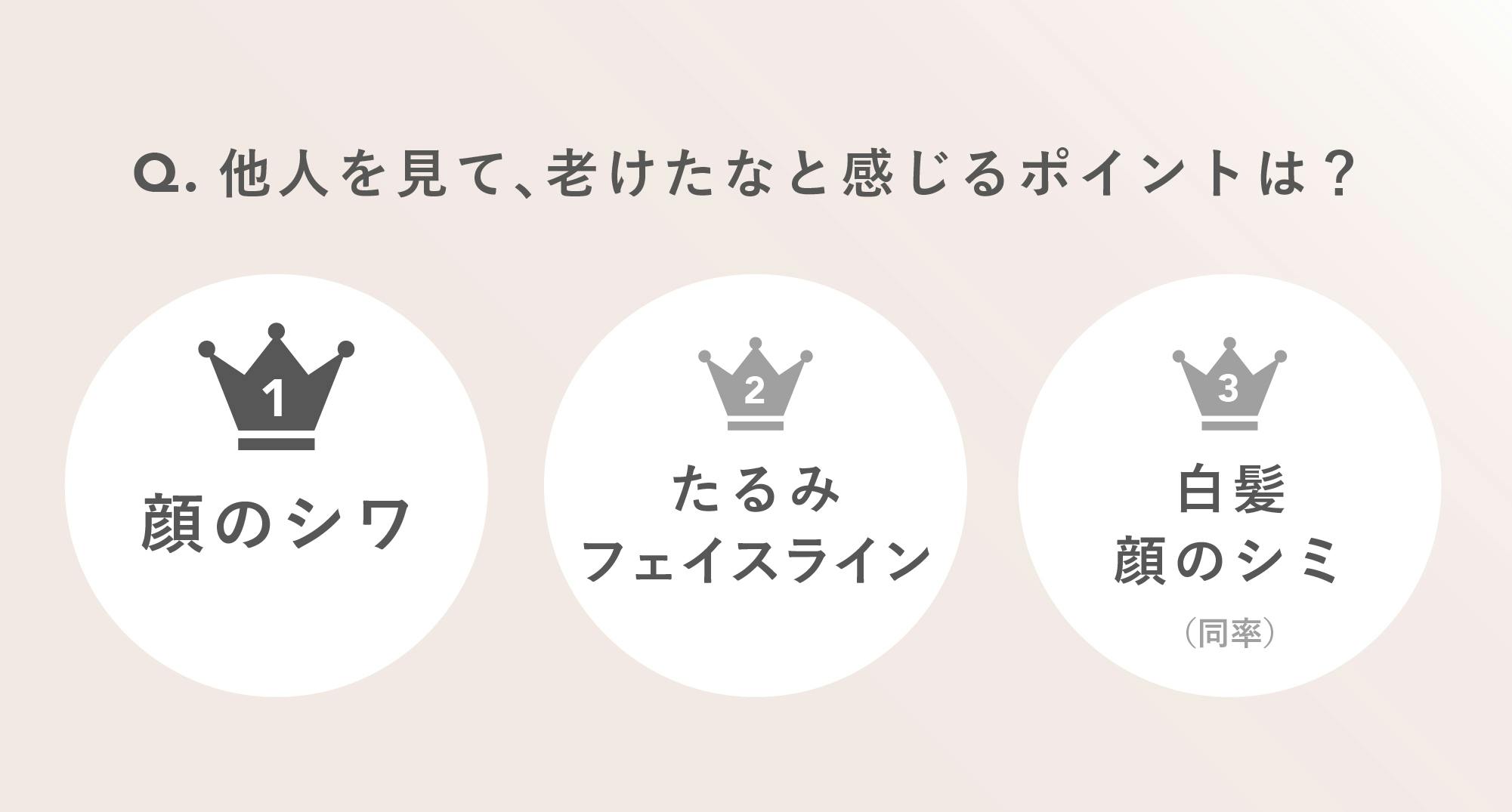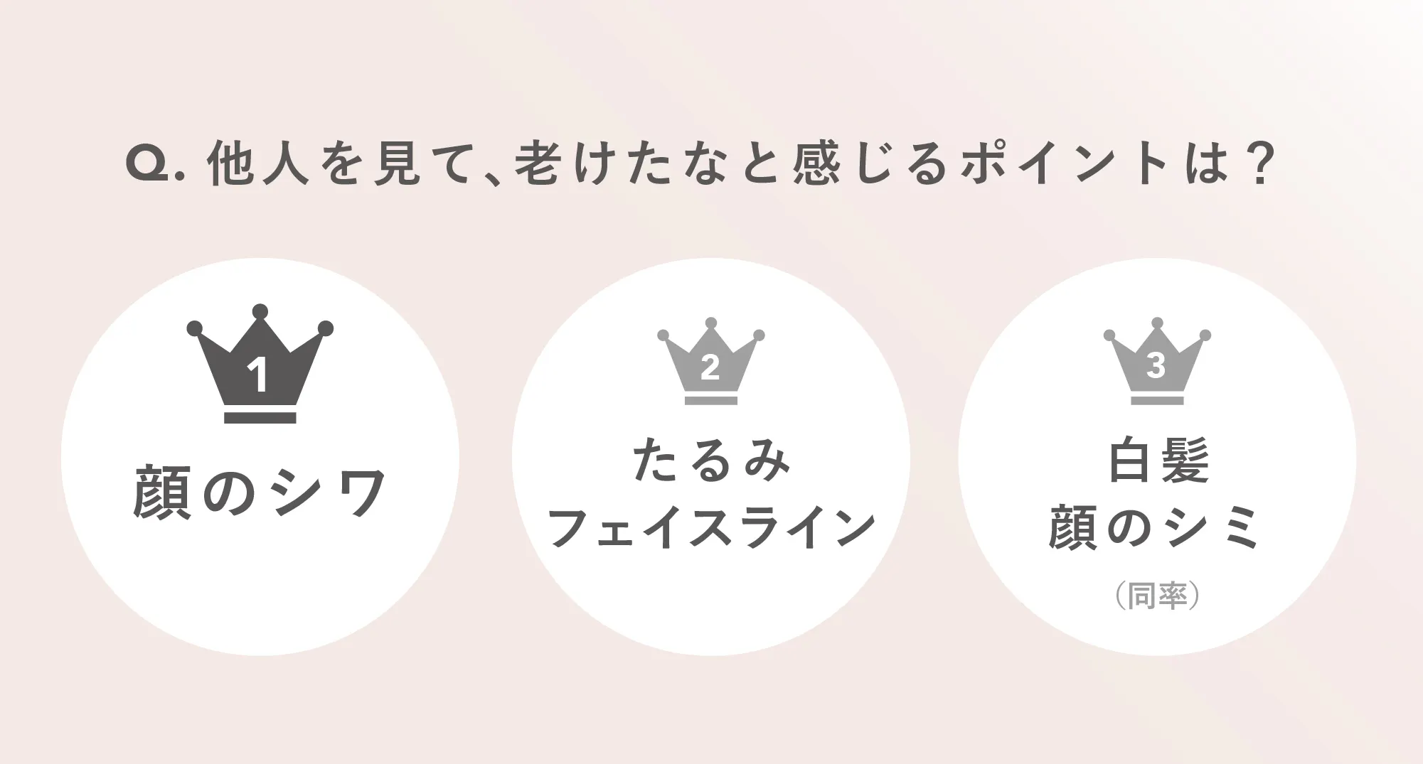 40代の方を中心に当社で実施したモニターアンケートでは「他人を見て老けたと感じるポイント」の1位が顔のシワとなっています。