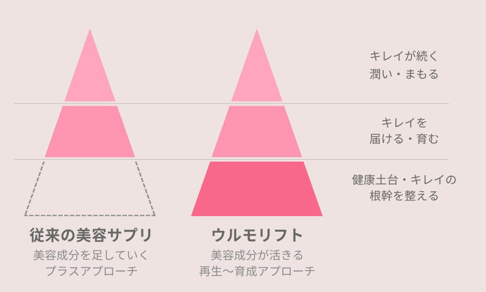 ウルモリフトは現代の生活習慣や食生活と照らし合わせ、これまで持っていた機能や働きを正しく戻し、内側からのキレイが続くことを目指した、忙しい毎日を送るミドル世代にこそ摂ってほしい再生~育成サプリメントです。