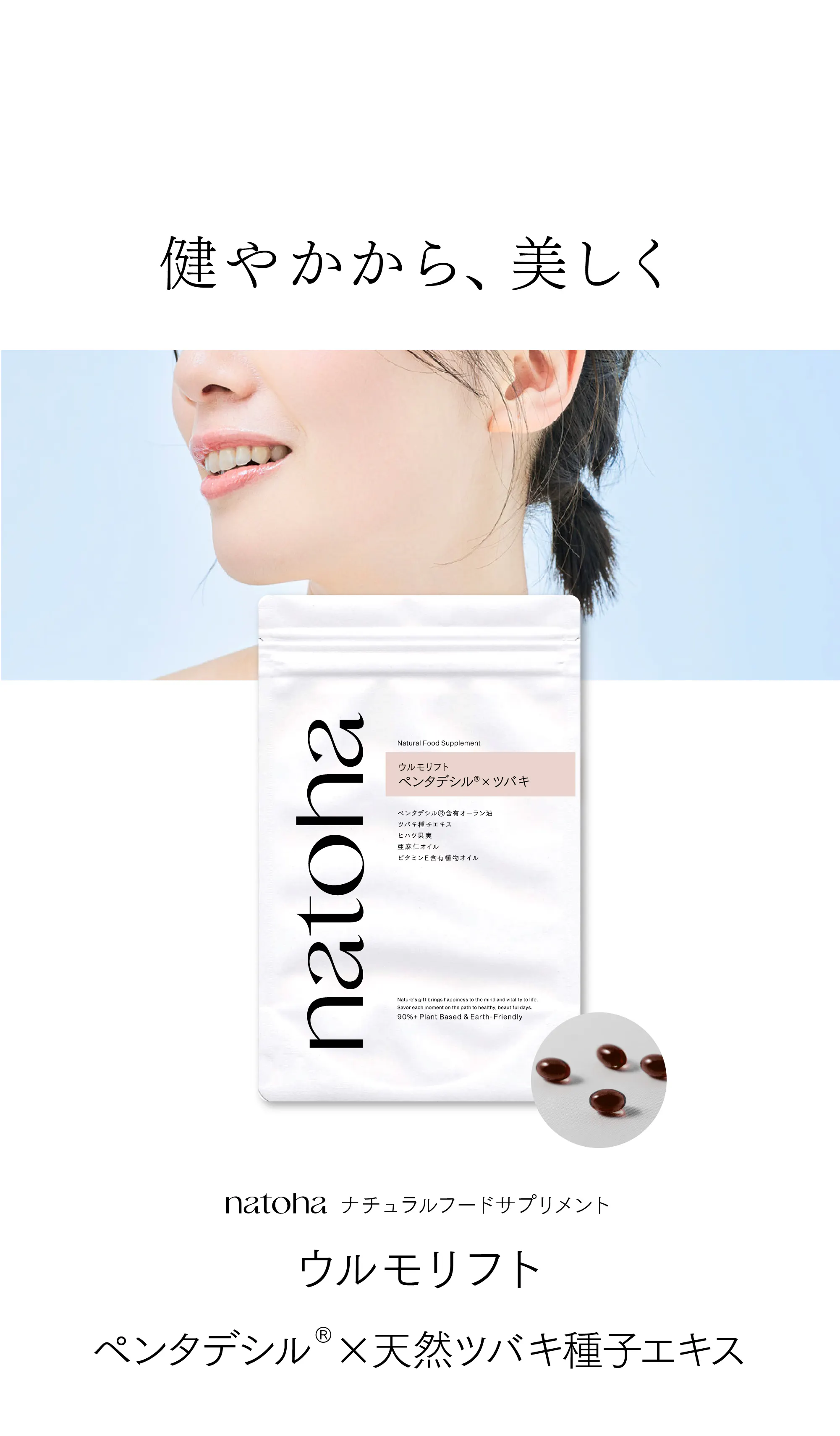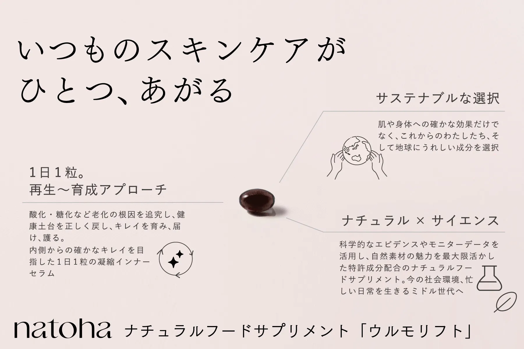 今回、ウルモリフトをラインナップに加えたnatohaブランドにおいては、"自然素材の恵みを活かして、健やかな毎日や心地よい時間をお届けする"という基本理念と3つの約束をベースに、食品=美味しさ、サプリ=効果、とその"モノ"に本来求められている目的と心地よさを追求し、モノづくりに取り組んできました。