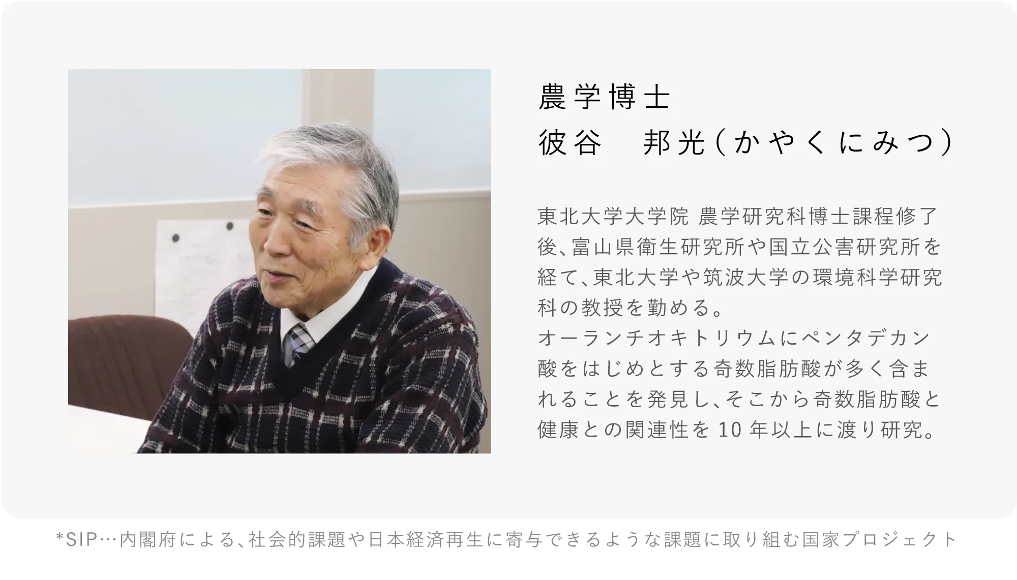 そんな想いを抱く中、オーラン油(ペンタデシル含有オーランチオキトリウム)とその開発者である彼谷先生、開発会社の代表である坪井社長など長きに渡って第一線で脂肪酸やプロテオグリカンなどの研究開発に携わってきた方々に出会ったことがプロジェクトを大きく前進させるきっかけとなりました。