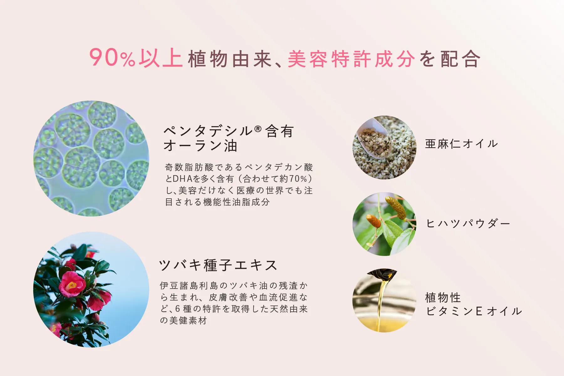 自然豊かな伊豆諸島利島産ツバキの搾り粕をアップサイクルしたツバキエキス、天然海洋資源の乱獲や気候変動による天然水産資源の増減に左右されない天然の藻類から生まれたペンタデシルⓇ含有オーラン油を主原料とし、肌や身体への確かな効果だけでなく、これからのわたしたちと子供たち、そして地球にうれしい植物性成分90%超のサプリメントが誕生しました。