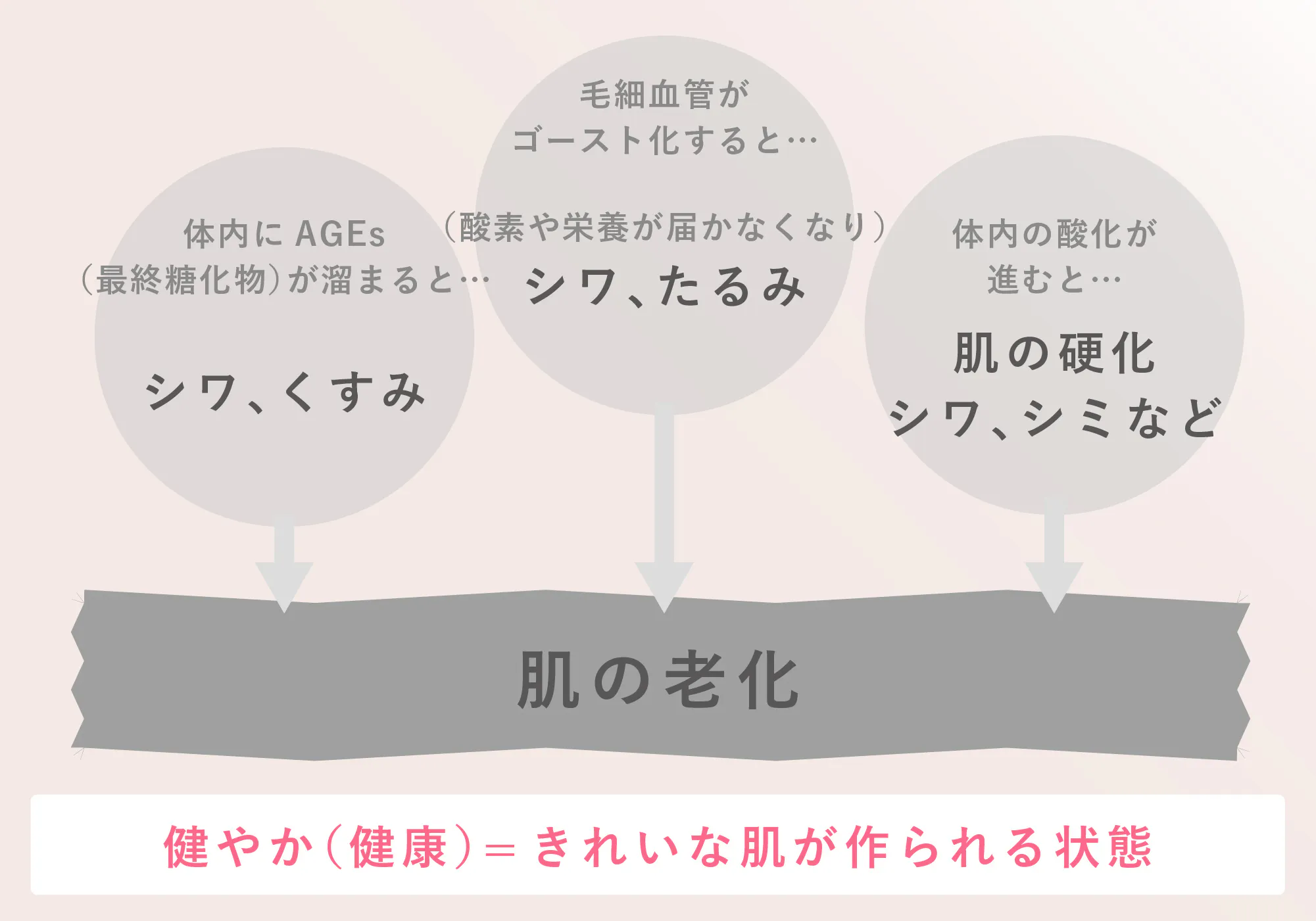 そう考えると、肌は体内で起きたことを表現しているのであり、結果的に酸化や糖化が進みづらい「健やか(健康的)な状態」≒「キレイな肌が作られる状態」と言えるのではないかと私たちは考えました。