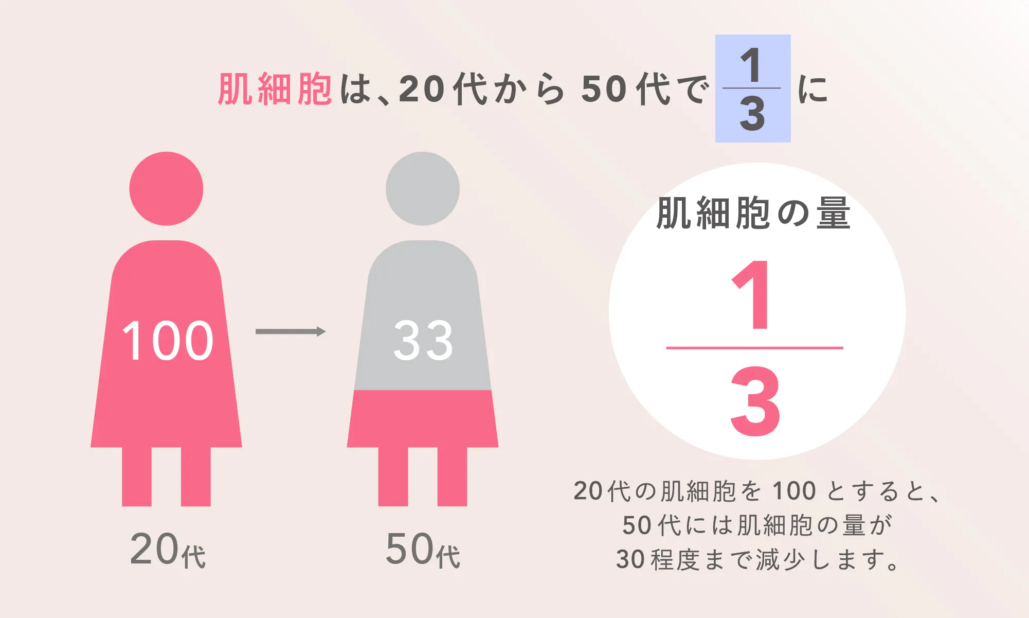 この肌細胞の量は、20代の頃と比較すると50代にはなんと1/3まで減少すると言われています。
