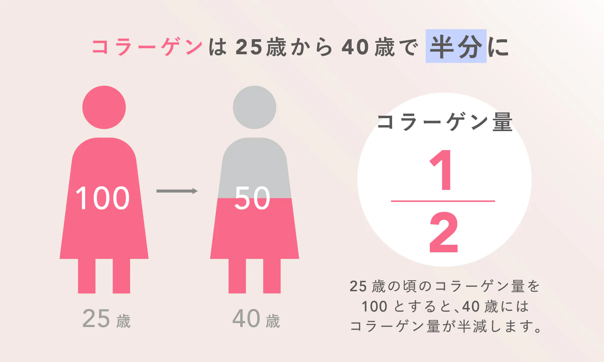 このコラーゲンも年齢を重ねるごとに新しく作り出す力が衰えてしまい、体内のコラーゲン量は25歳を100とすると、40歳には半分に減ってしまいます。