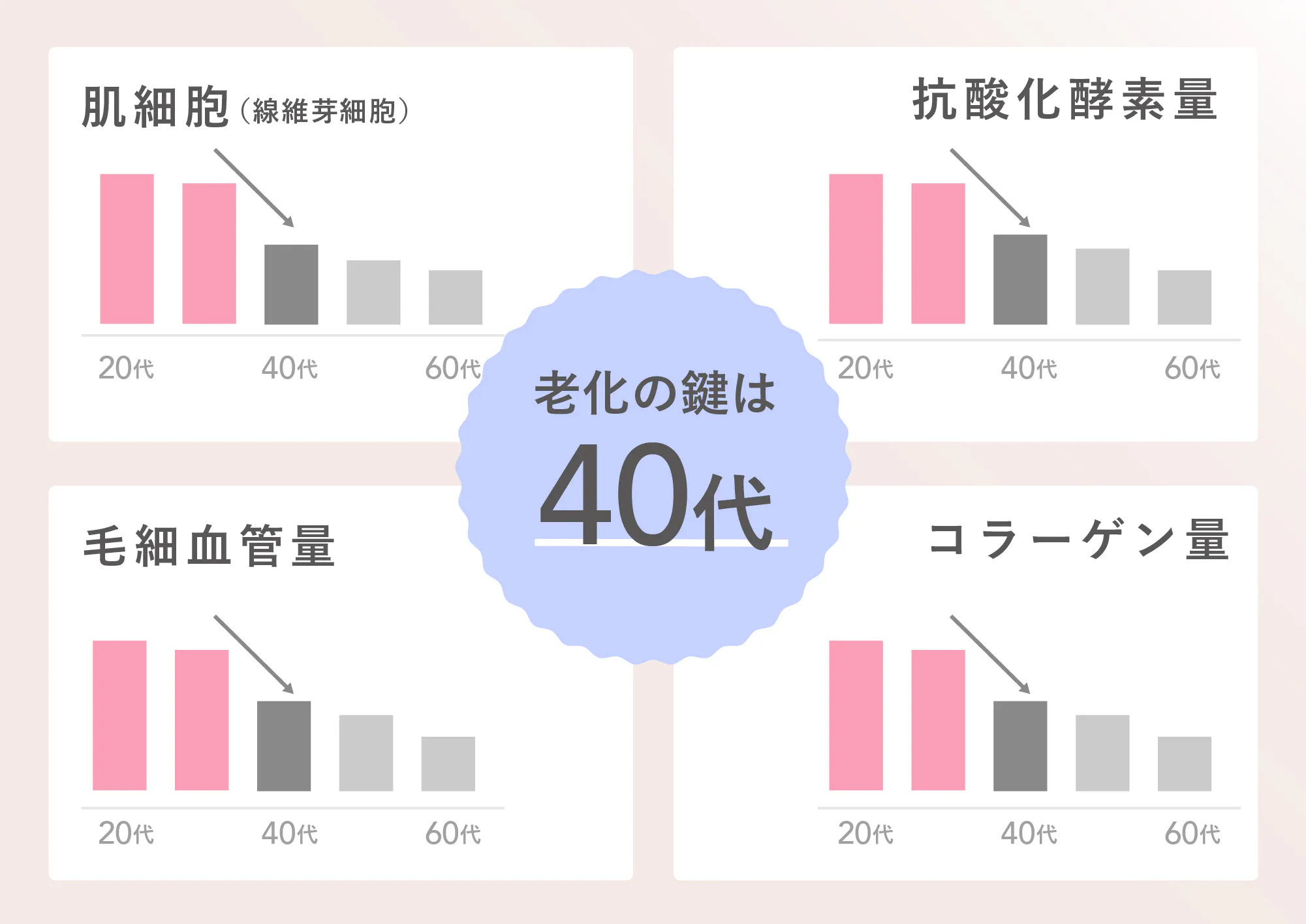40代から一気に減少する抗酸化酵素量、コラーゲンの生成力、肌細胞(線維芽細胞)etc...。