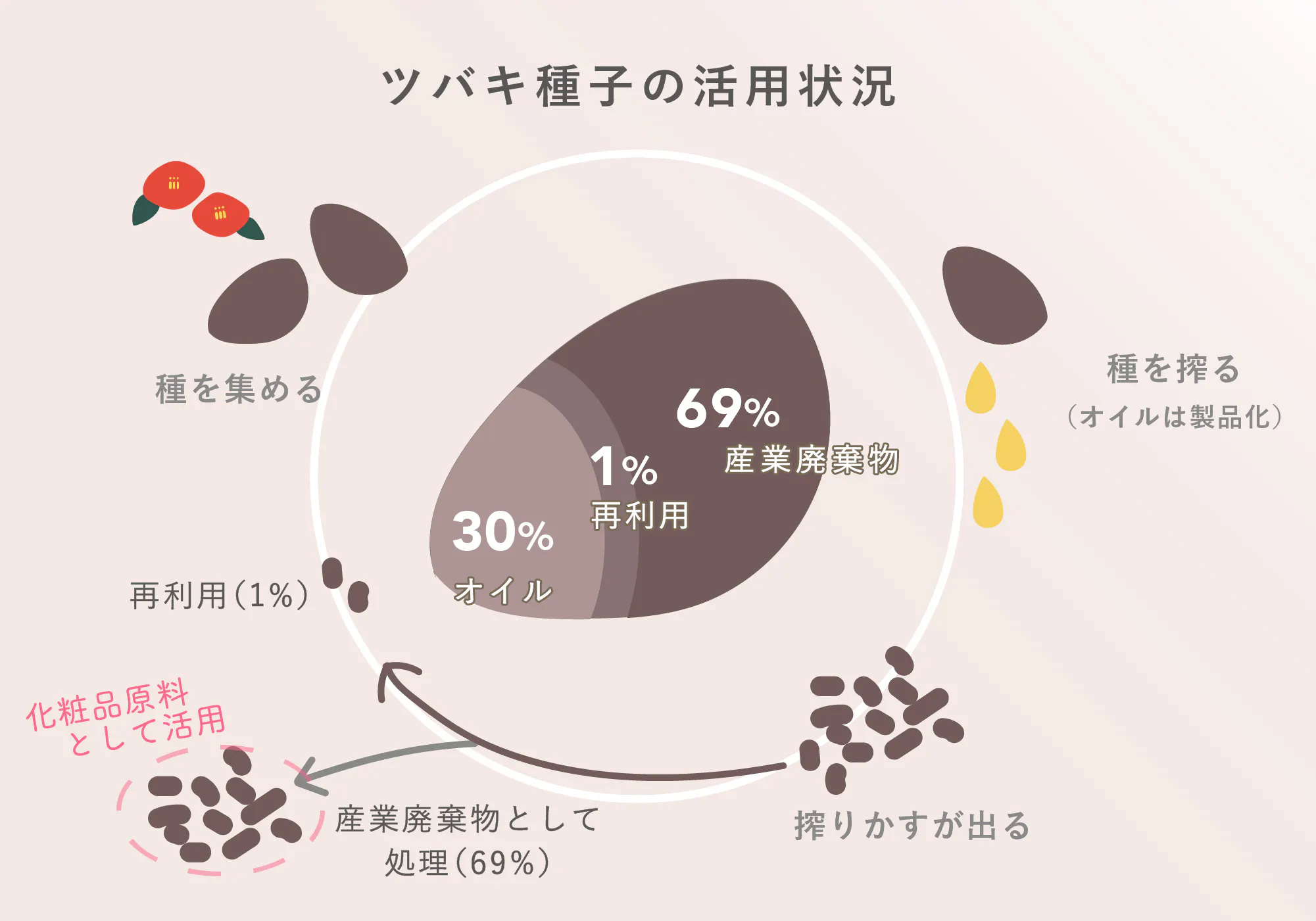 ツバキの種は3割がオイルとなり、絞り粕として残る7割の部分は肥料等で使用される以外は産業廃棄物として捨てられていましたが、現在では様々な機能や効果が実証され、美容・健康分野での活用が進められています。