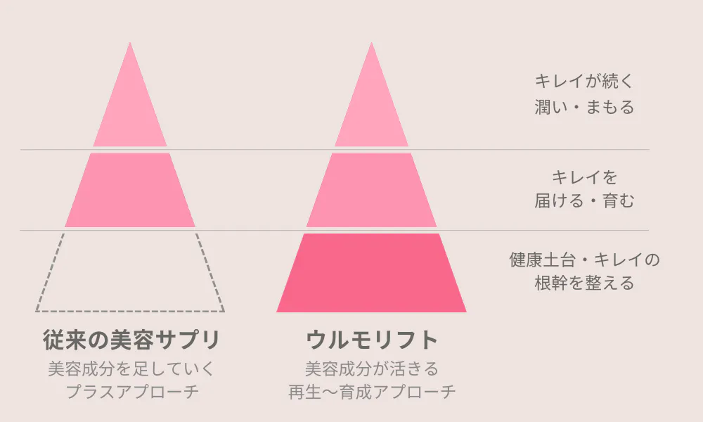 美容成分を多く摂取するというアプローチではなく、元々の働きを取り戻した上でキレイを循環させる再生~育成アプローチ。