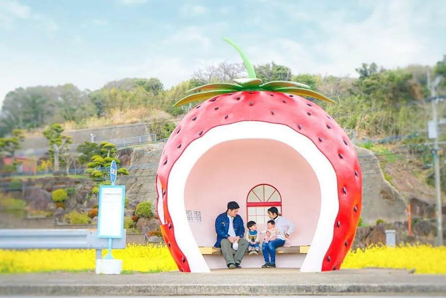 菜の花シーズンのイチゴバス停。黄と赤のコントラストが爽やか