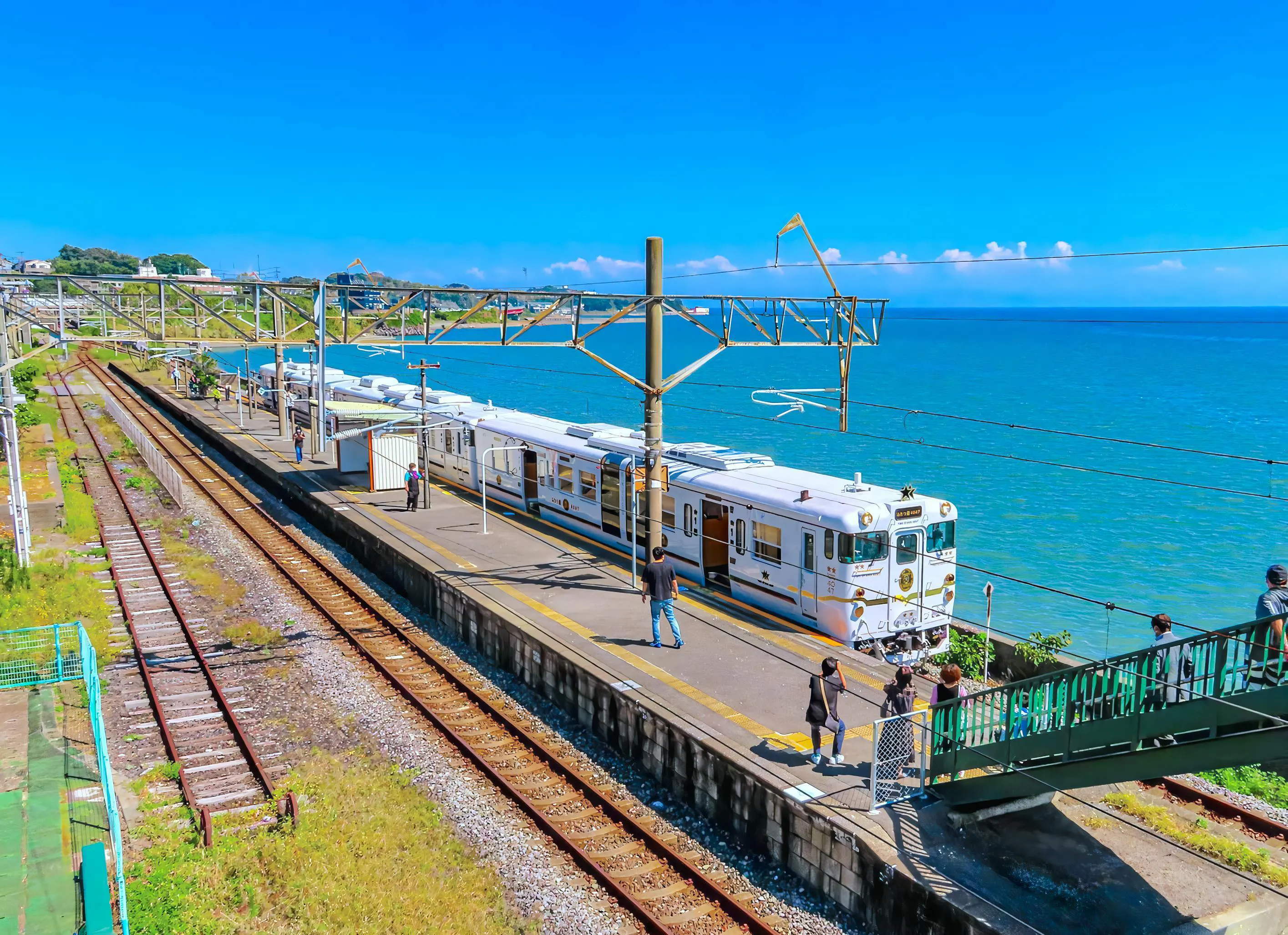 観光列車「ふたつ星4047」とエメラルドグリーンに輝く有明海。跨線橋からの景色も壮観