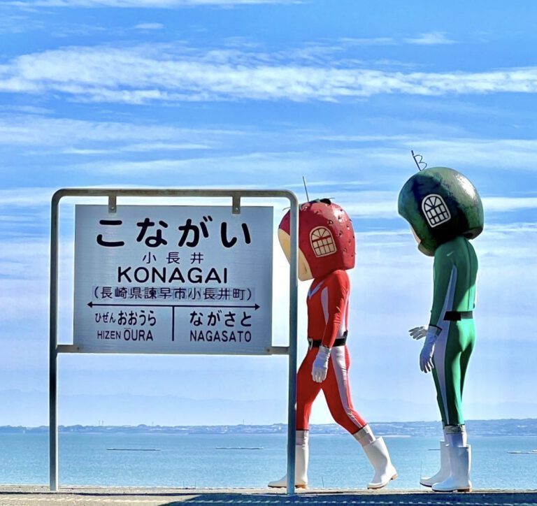 フルーツバス停を被った謎のレンジャー(?)が大パノラマの小長井駅に降り立ちます。